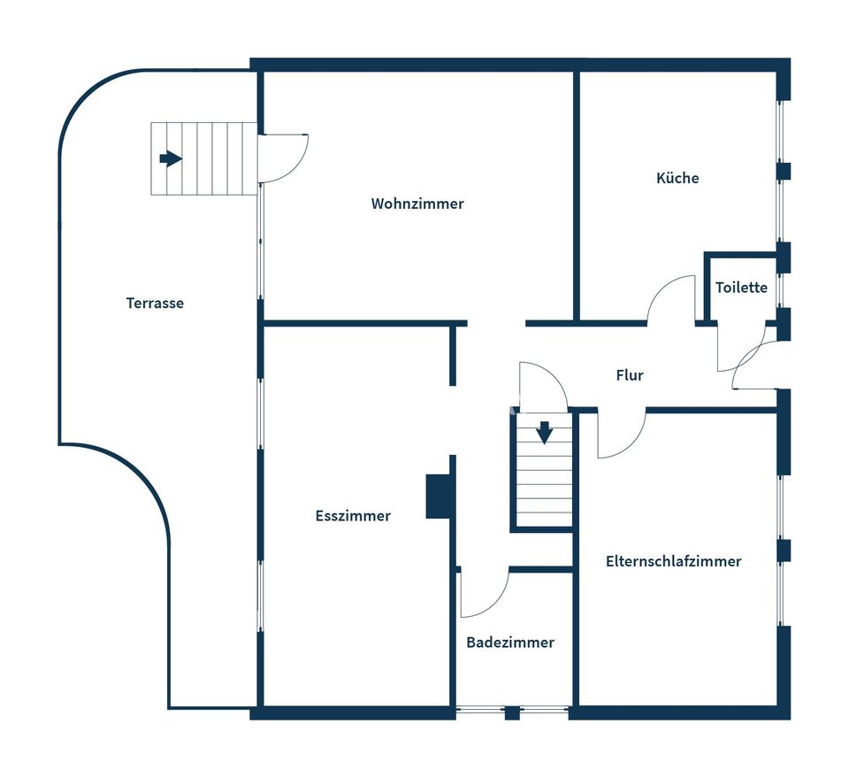 Besonders hervorzuheben ist die großzügige Raumaufteilung auf zwei Ebenen, wobei das Erdgeschoss mit seiner ebenerdigen Gestaltung alle Hauptfunktionen des Wohnens auf einer Ebene vereint. Sie betreten das Haus über eine helle Diele mit Garderobe. Von hier aus gelangen Sie in die sehr große Wohnküche mit moderner Einbauküche, in das angrenzende Esszimmer mit etwa 22 Quadratmetern, ein Schlafzimmer sowie in das geräumige Wohnzimmer mit rund 24 Quadratmetern und direktem Zugang zur Terrasse und in den herrlich eingewachsenen Garten. Ein modernes Tageslicht-Duschbad rundet das Raumangebot im Erdgeschoss ab.