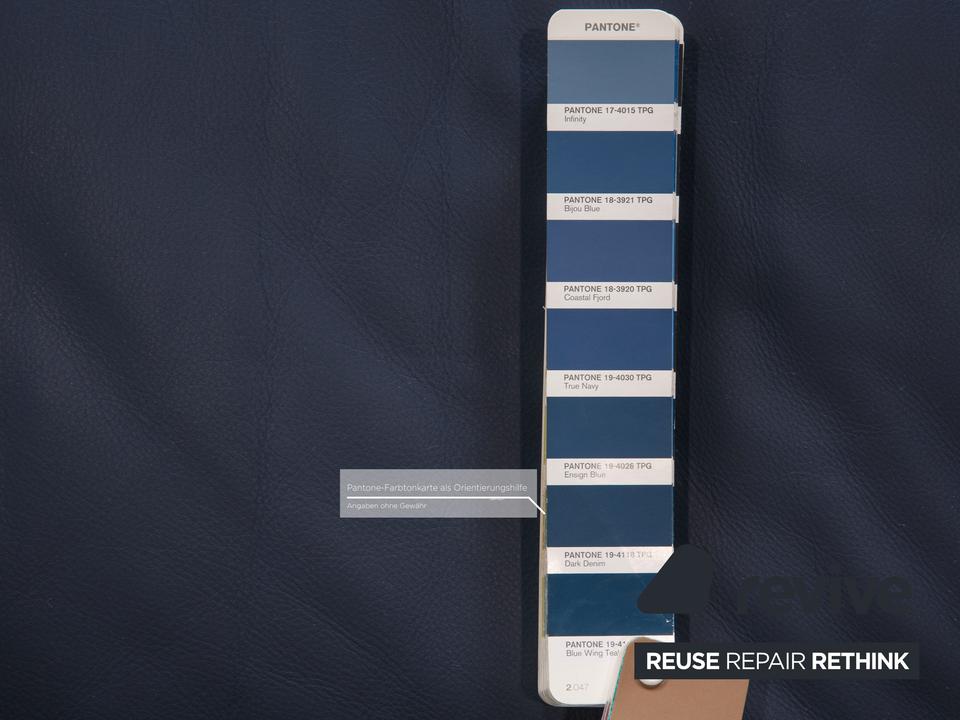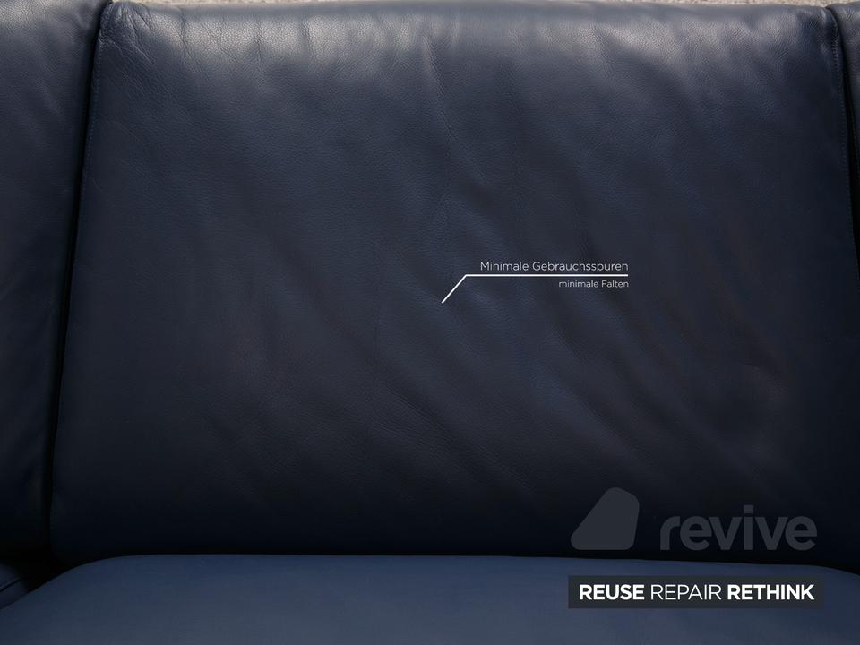 Das Fiandra Sofa von Cassina ist mit einem blauen Echtleder bezogen und steht auf schwarzen Füßen. Das klassische, zeitlose Design und die abgerundeten Sitzflächen zeichnen den Dreisitzer aus.