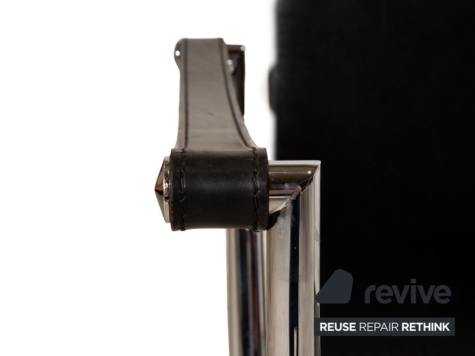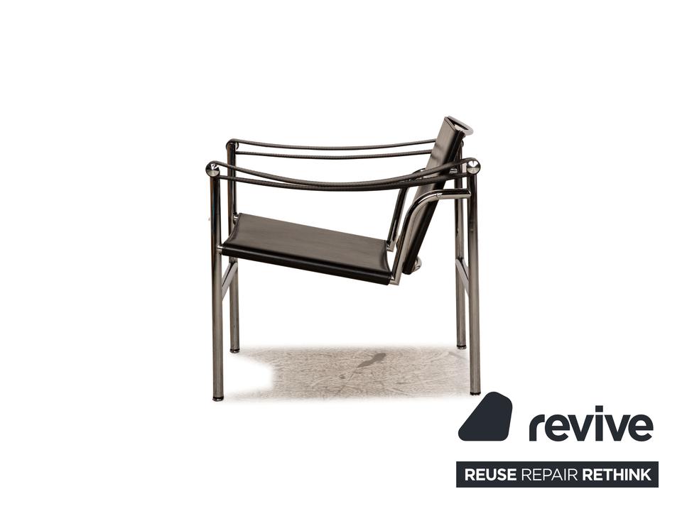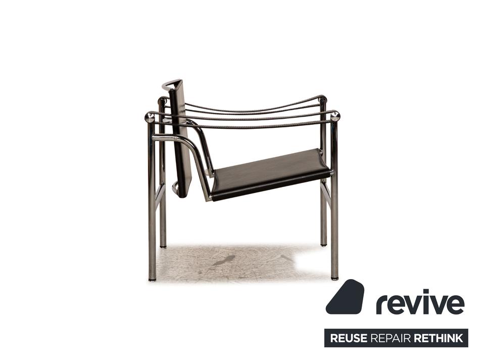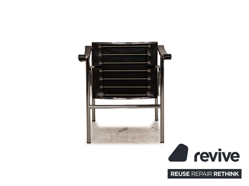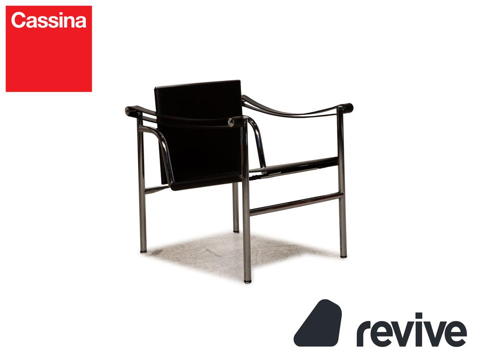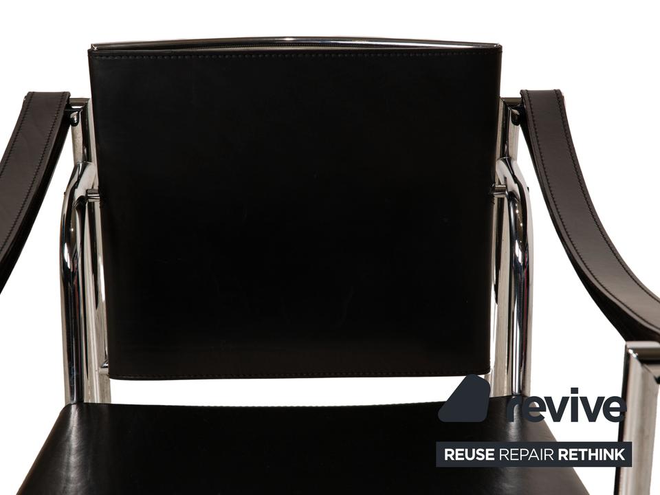 Der Le Corbusier LC 1 Sessel von Cassina ist mit einem schwarzen Echtleder bezogen und steht auf silbernen Metallfüßen. Die praktischen Armlehnen und das zeitlose Design zeichnen ihn aus.