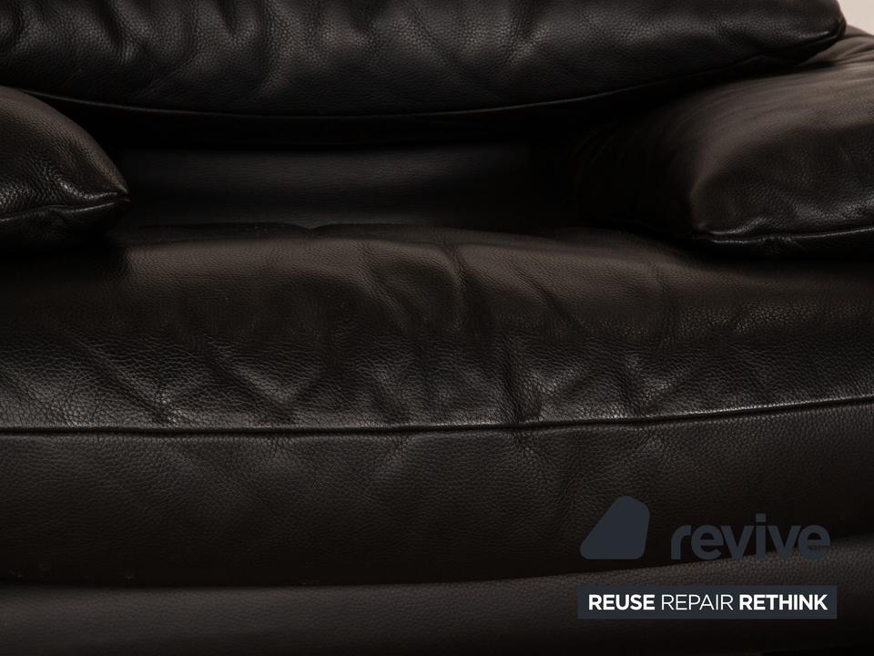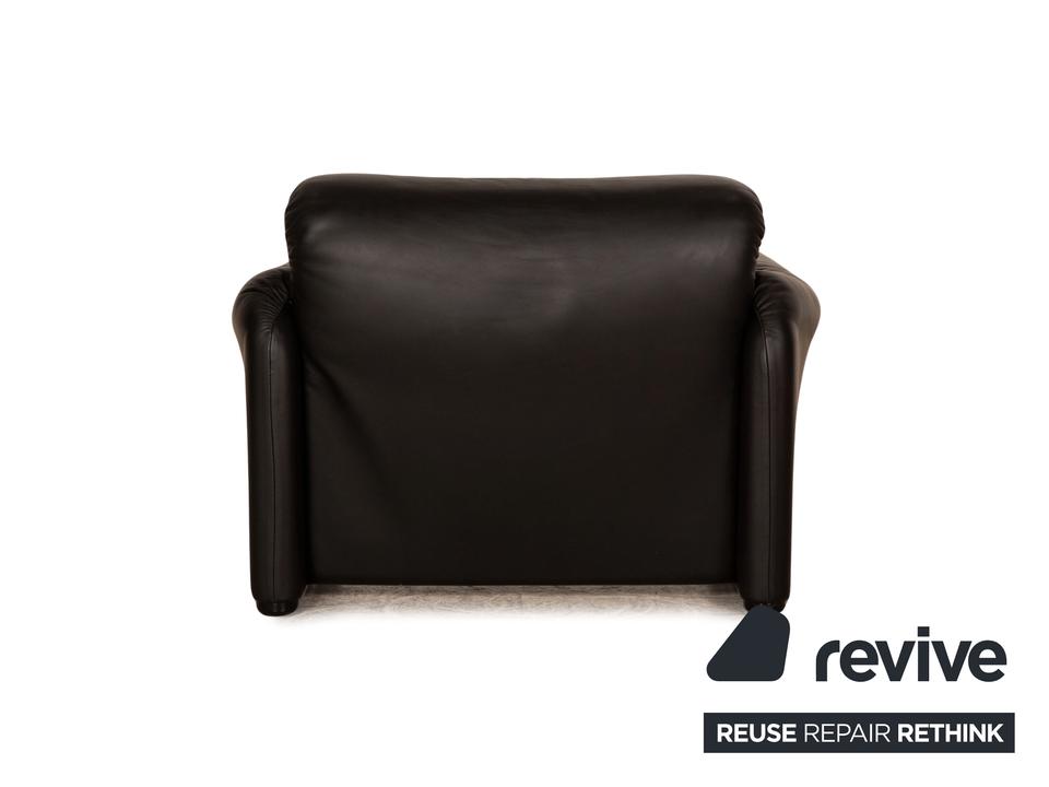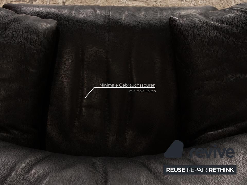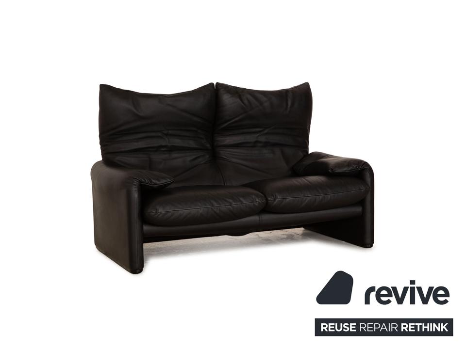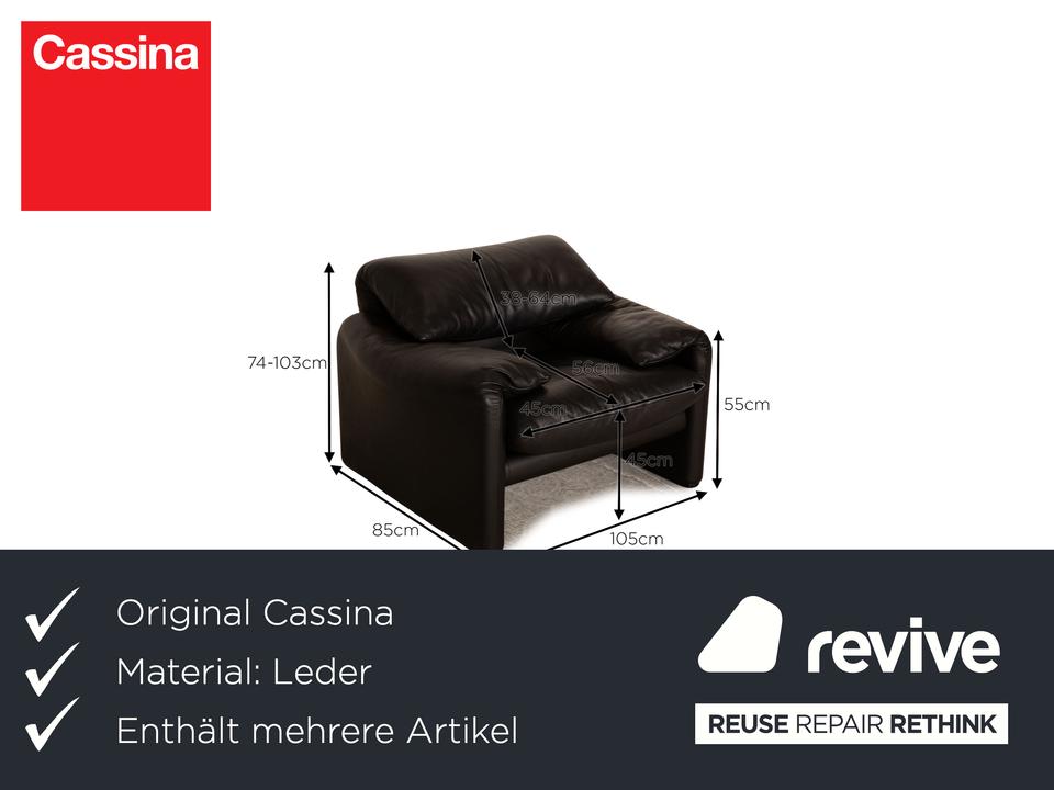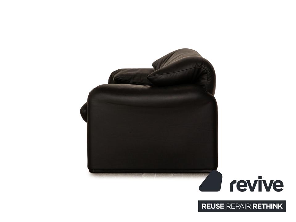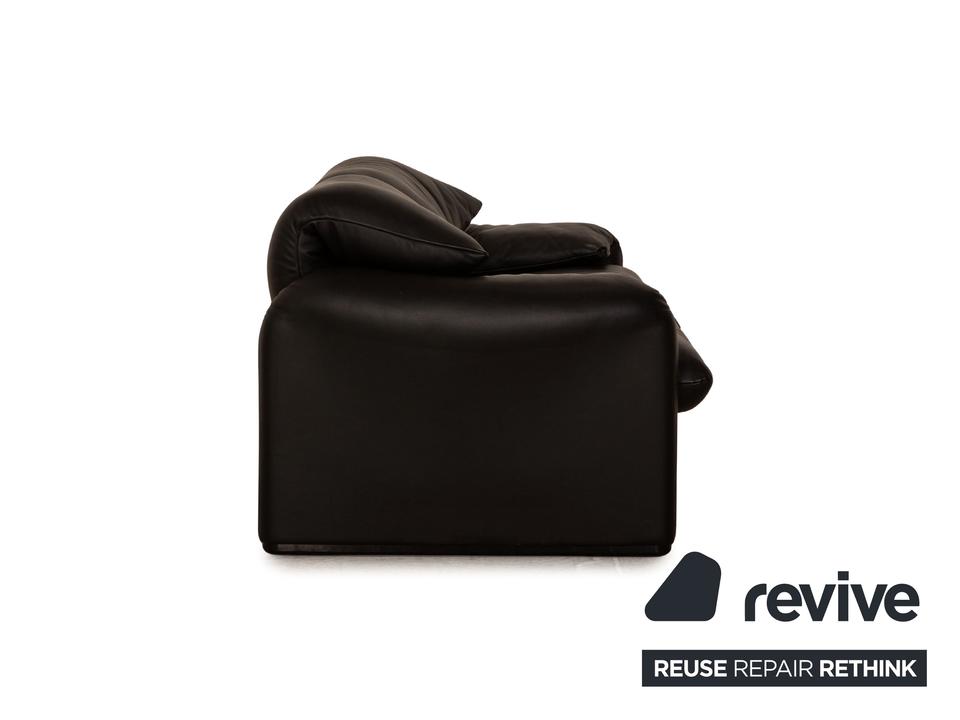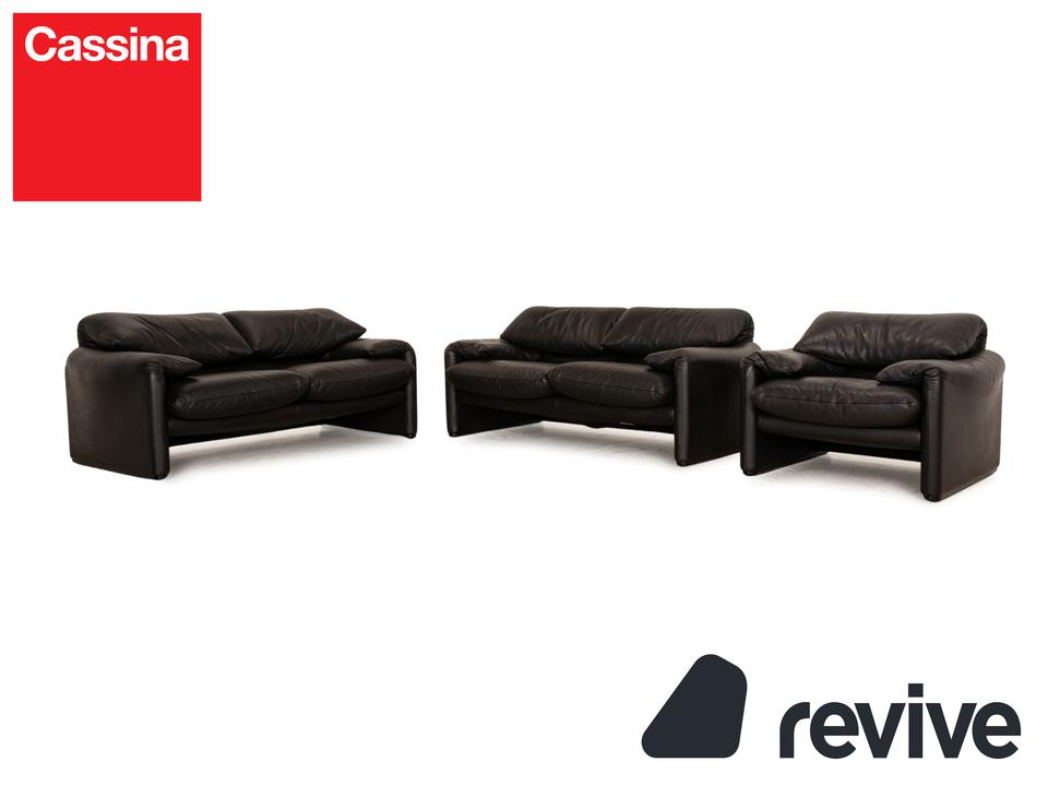 Die Maralunga Sofa Garnitur von Cassina ist mit einem schwarzen Echtleder bezogen und steht auf bodentiefen Seitenteilen. Das klassische Design und die abgerundeten Kanten zeichnen die Garnitur aus. Sie besteht aus einem Sessel und zwei Zweisitzern.