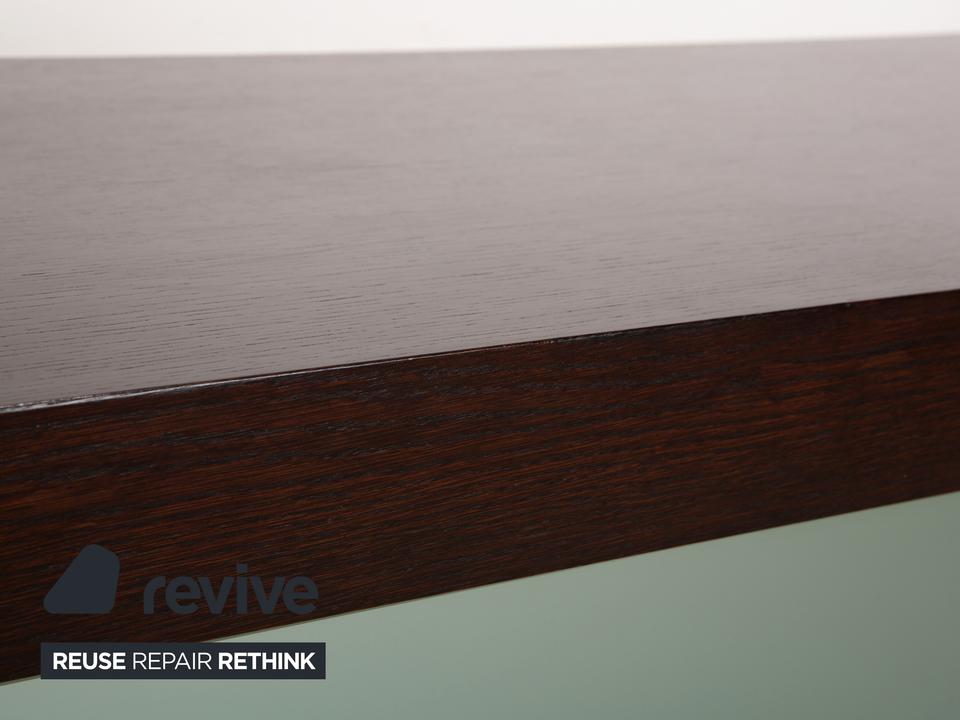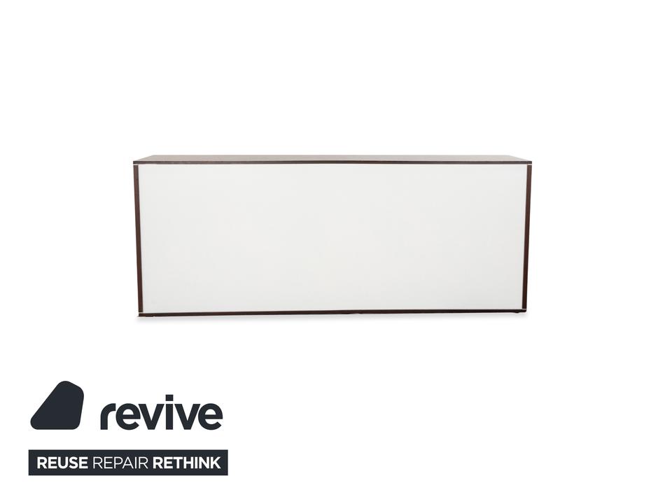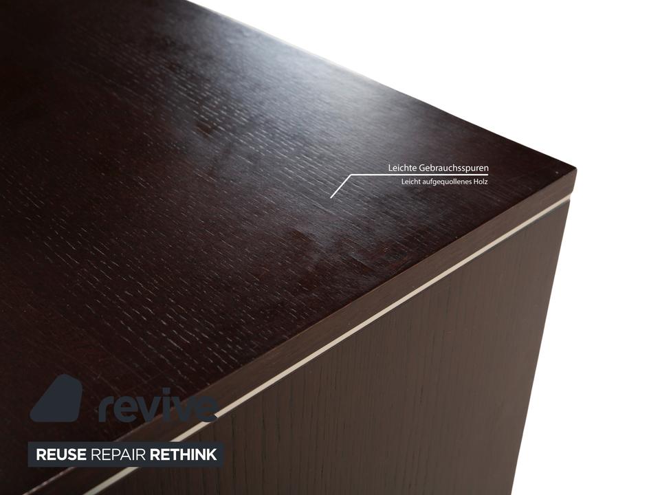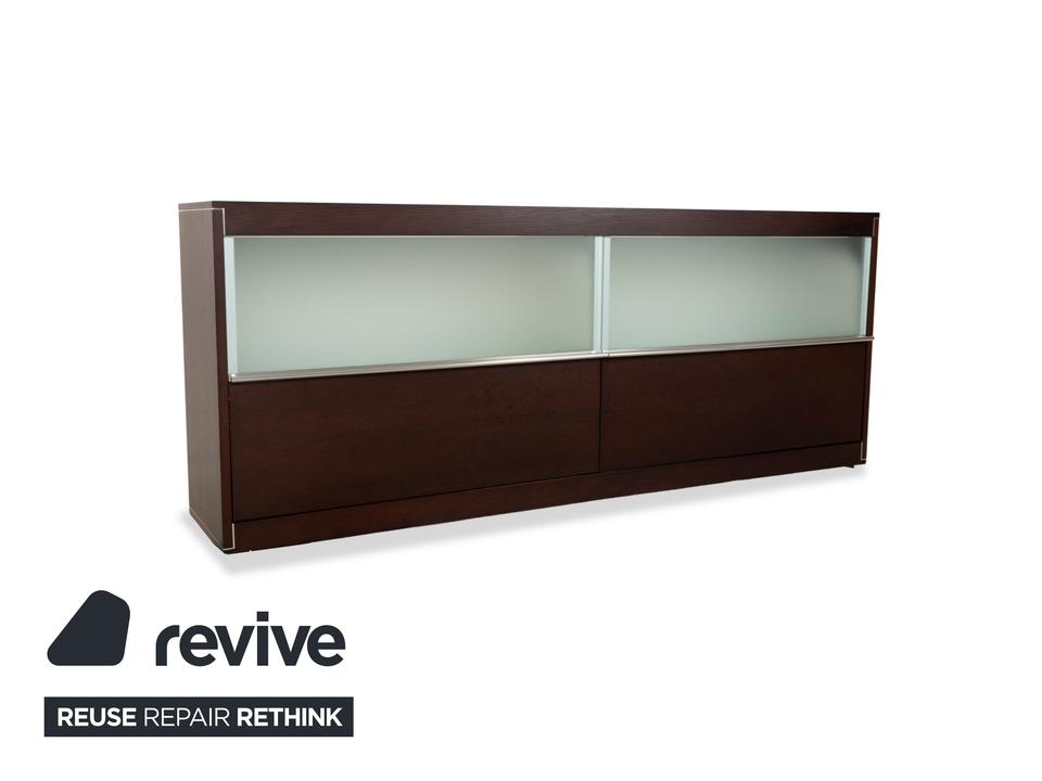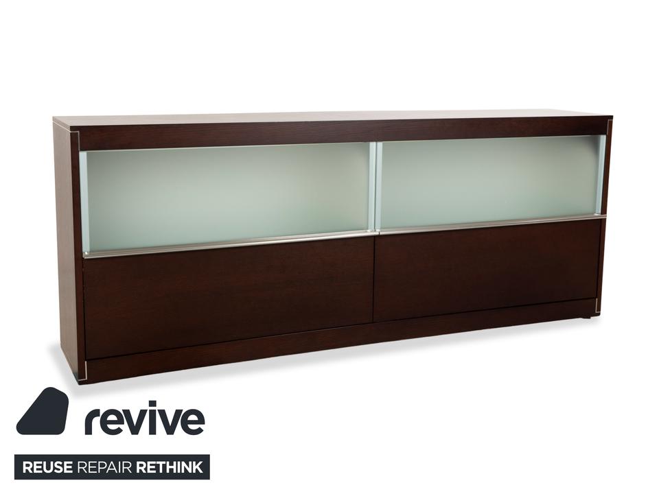 Das Sideboard bietet viel Stauraum und ist aus dunkelbraunem Holz und satiniertem Glas gefertigt.