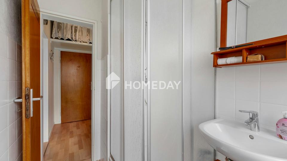 Beim Betreten der Wohnung gelangt man in den Flur, der nicht nur als Eingangsbereich dient, sondern auch einen praktischen kleinen Abstellraum beherbergt. Geradeaus befindet sich das helle Tageslichtbad, das mit einer Dusche ausgestattet ist und eine angenehme Atmosphäre bietet. Links vom Flur geht es in die schöne Küche, die mit einer voll funktionsfähigen Pantry-Küche ausgestattet ist und ausreichend Platz für einen kleinen Essbereich bietet.