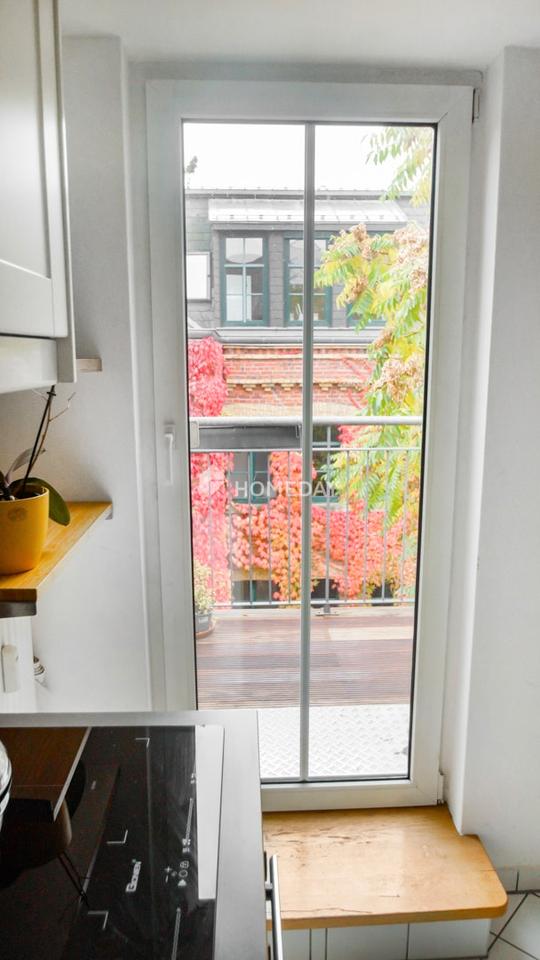 Das Schlafzimmer liegt ruhig und bietet ausreichend Platz für ein großes Bett und Schrankmöbel. Direkt daneben befindet sich die separate Küche, die Zugang zu einem zweiten Balkon bietet. Der Ostbalkon lädt in den Sommermonaten zu gemütlichen Mahlzeiten im Freien ein.