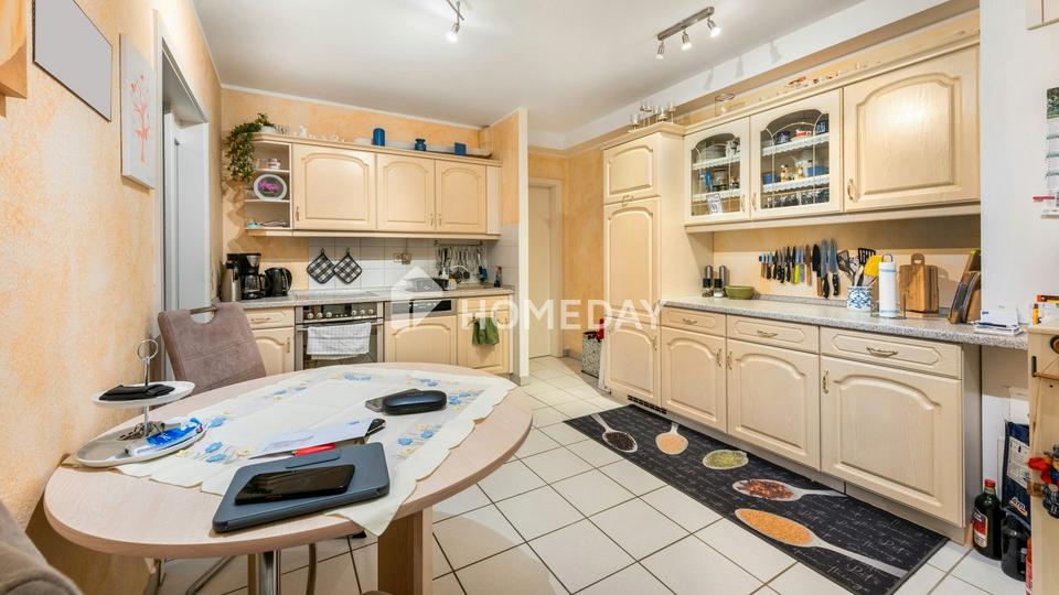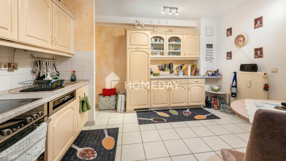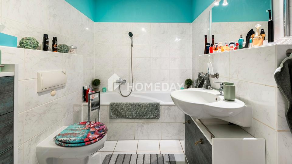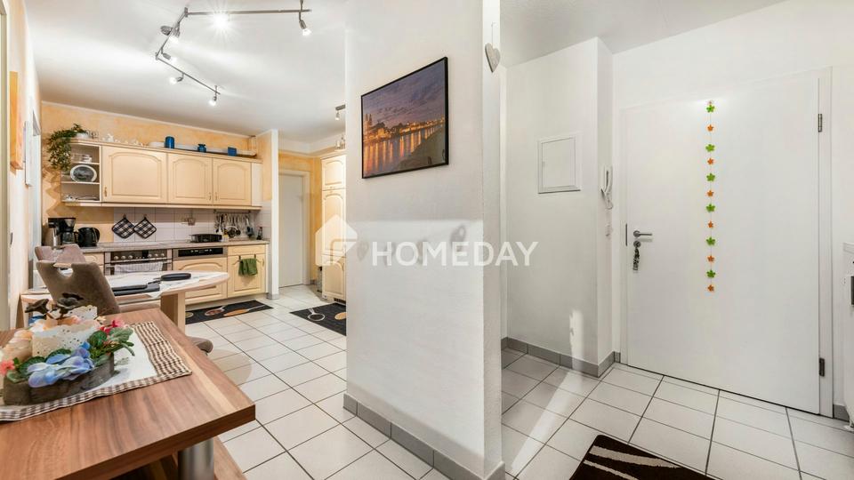 Die Küche überzeugt mit ihrer gepflegten Einbauküche, die alle wichtigen Geräte und ausreichend Stauraum bietet. Hier lassen sich Mahlzeiten nicht nur zubereiten, sondern auch in gemütlicher Runde genießen – der Raum ist groß genug, um einen Esstisch zu integrieren und damit zum kommunikativen Mittelpunkt der Wohnung zu machen. Das Badezimmer präsentiert sich hell und freundlich. Es ist modern gefliest und mit einer Badewanne ausgestattet, die zum Entspannen nach einem langen Tag einlädt. Klare Linien, helle Farben und eine gepflegte Ausstattung schaffen hier eine Atmosphäre, in der man sich gerne zurückzieht und wohlfühlt.
