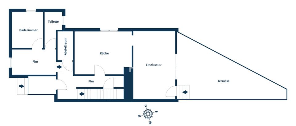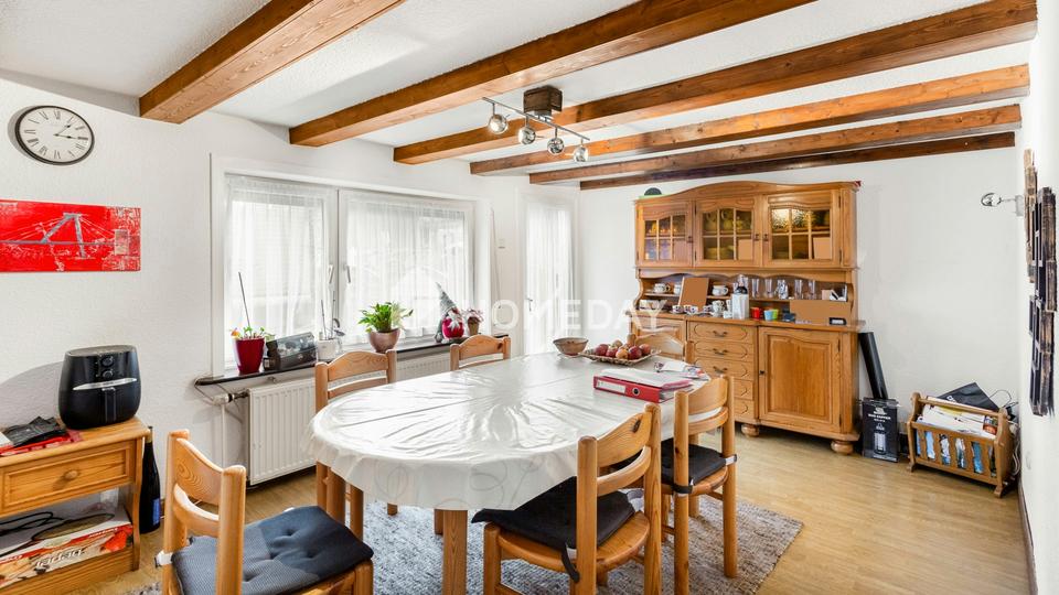 Im Erdgeschoss betreten Sie das Haus über einen zentralen Flur. Die Küche ist funktional geschnitten und mit einer Einbauküche ausgestattet. Angrenzend befindet sich das Esszimmer mit direktem Zugang zur Terrasse. Die Raumstruktur ist klar und alltagstauglich, mit kurzen Wegen und guten Stellflächen. Ergänzt wird diese Ebene durch ein separates WC, ein Badezimmer mit Tageslicht, Dusche und Badewanne sowie einen praktischen Abstellraum.