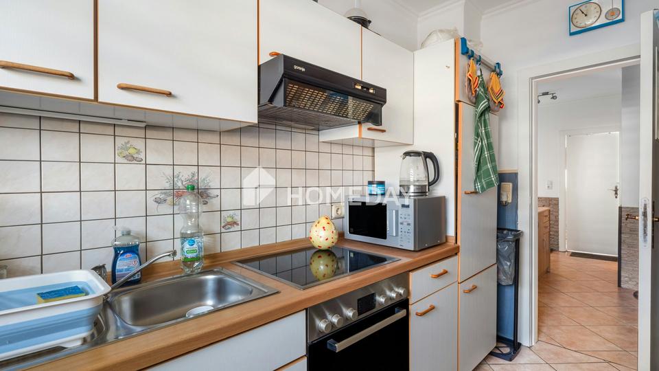 Die Küche wirkt kompakt und gut strukturiert. Sie bietet ausreichend Fläche für die täglichen Abläufe, während die durchgehend hellen Fliesenböden einen gepflegten Gesamteindruck unterstreichen.