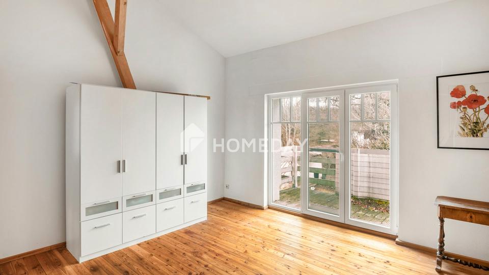 Diese vom Eigentümer bewohnte Einheit überzeugt durch Helligkeit und eine durchdachte Raumaufteilung. Ein großzügiger, lichtdurchfluteter Flur mit warmen Holzdielen vermittelt sofort Behaglichkeit. Das Wohnzimmer bildet den Mittelpunkt: Bodentiefe Fenster öffnen den Blick ins Grüne, der Kamin sorgt für eine wohnliche Atmosphäre. %BREAK%