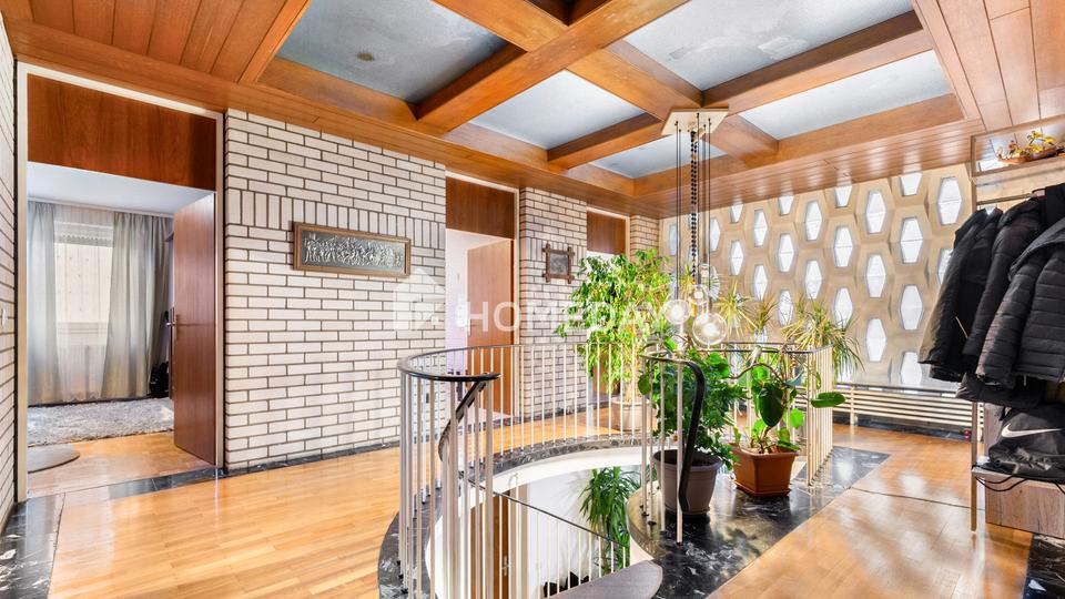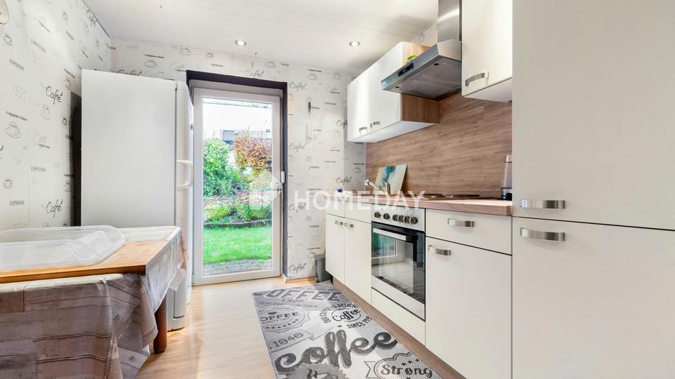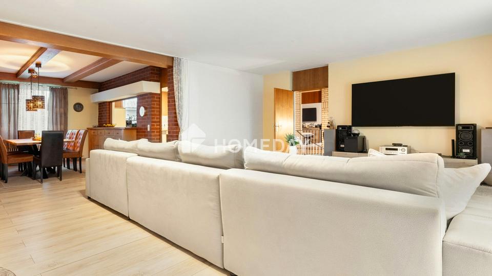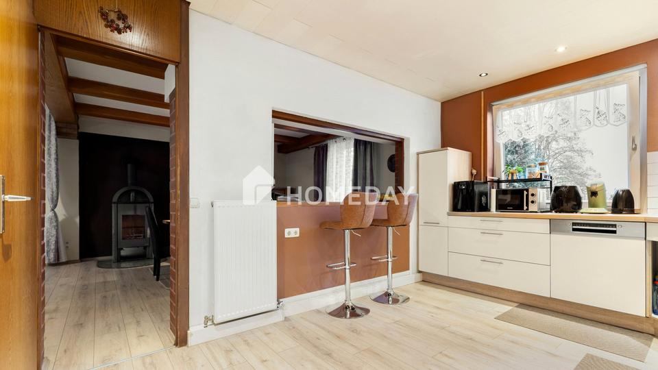 Mit einer Wohnfläche von rund 180 Quadratmetern, verteilt auf sechs Zimmer, Küche, Badezimmer, Gäste-WC und zwei Abstellräumen, bietet das Haus viel Raum für individuelle Wohnideen. Im Obergeschoss lädt das gemütliche Wohnzimmer mit Kamin zum Entspannen ein und schafft eine warme, wohnliche Atmosphäre. Große Fensterflächen lassen viel Tageslicht herein und sorgen für ein offenes, freundliches Raumgefühl.