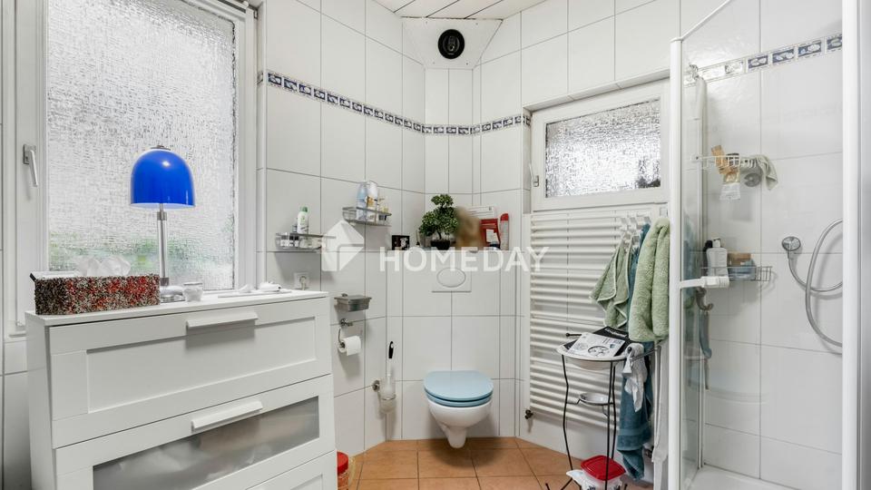 Im Erdgeschoss erwartet Sie ein großzügiges Wohnzimmer mit Kaminofen, das zum Verweilen einlädt, sowie ein Esszimmer, das sich ideal für gesellige Runden eignet. Die offen gestaltete Einbauküche mit hochwertigen Markengeräten bildet das Herzstück des Hauses. Abgerundet wird diese Etage durch ein modernisiertes Badezimmer. Im Obergeschoss befinden sich das helle Schlafzimmer sowie ein weiteres Badezimmer, das mit einer Eckbadewanne, separater Dusche, Tageslicht und einem Handtuchwärmer höchsten Komfort bietet. Ein Gäste-WC ergänzt das Raumangebot.