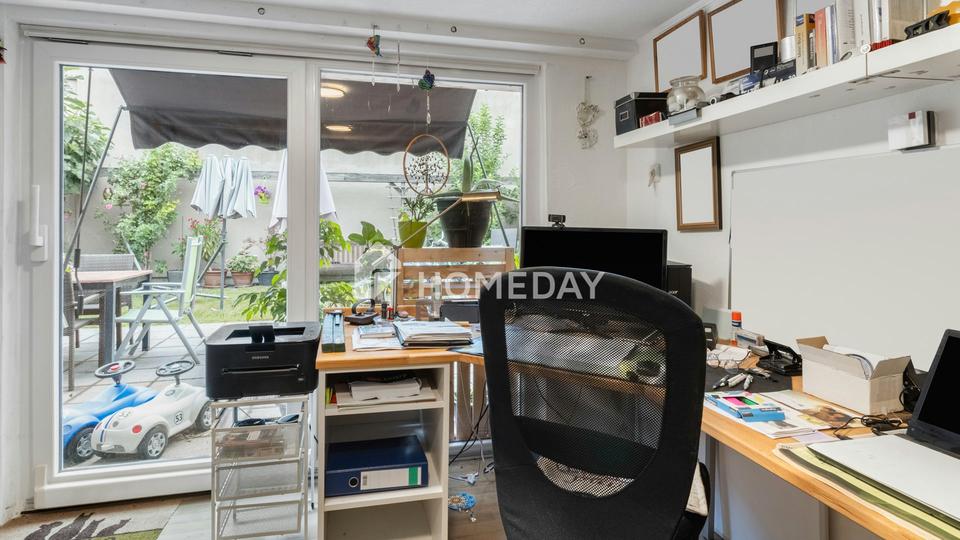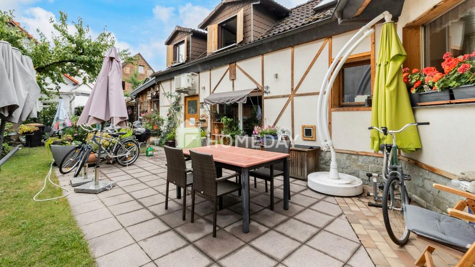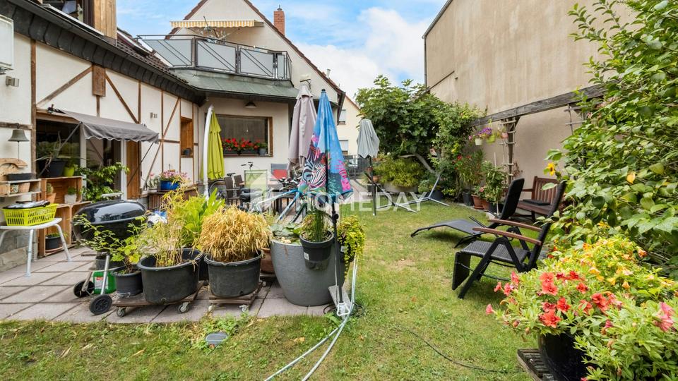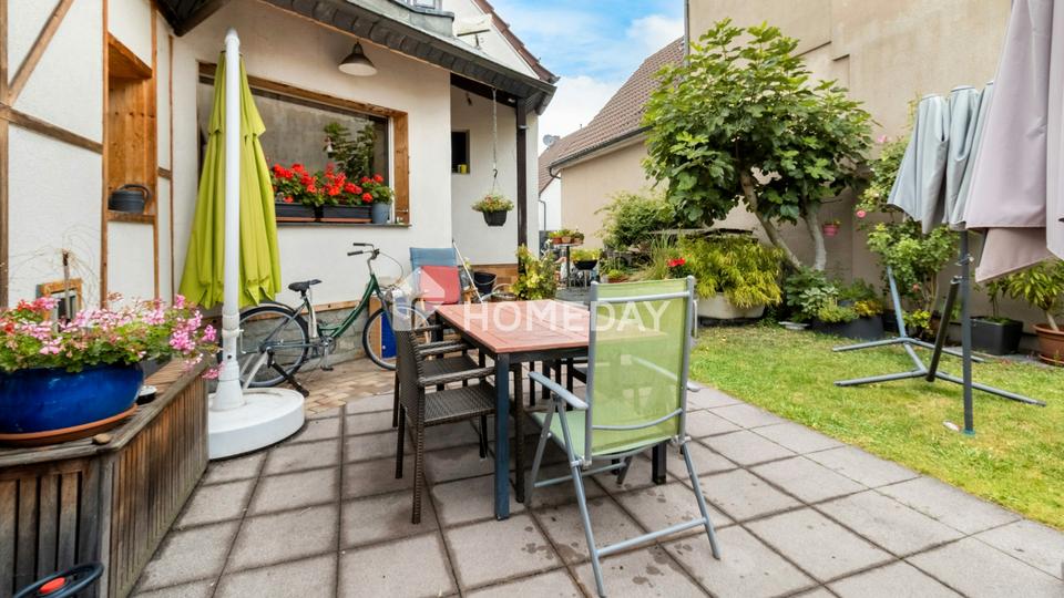 Der Außenbereich überzeugt durch einen liebevoll angelegten, pflegeleichten Garten und eine rund 25 Quadratmeter große Terrasse mit östlicher Ausrichtung, die zu sonnigen Stunden im Freien einlädt. Ein Stellplatz auf dem Grundstück sorgt für bequeme Parkmöglichkeiten.