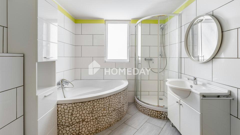 Ein weiteres Highlight ist das stilvolle Tageslichtbad, das mit einer großen Eckbadewanne und einer geräumigen Dusche zum Entspannen einlädt. Wellnessmomente in den eigenen vier Wänden sind hier garantiert!