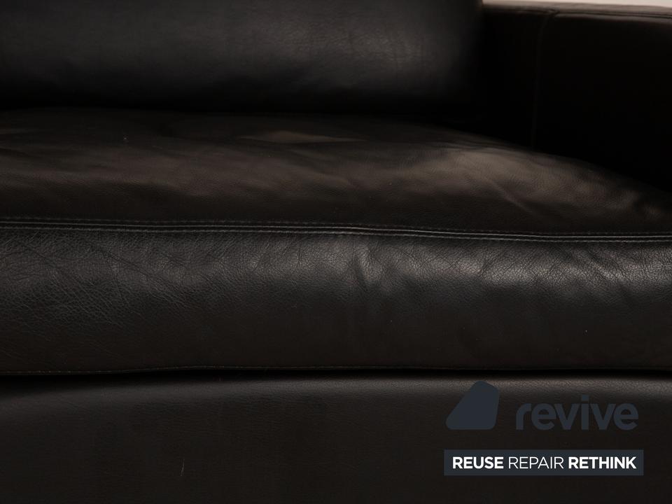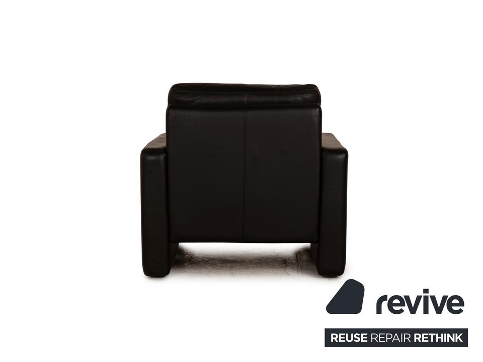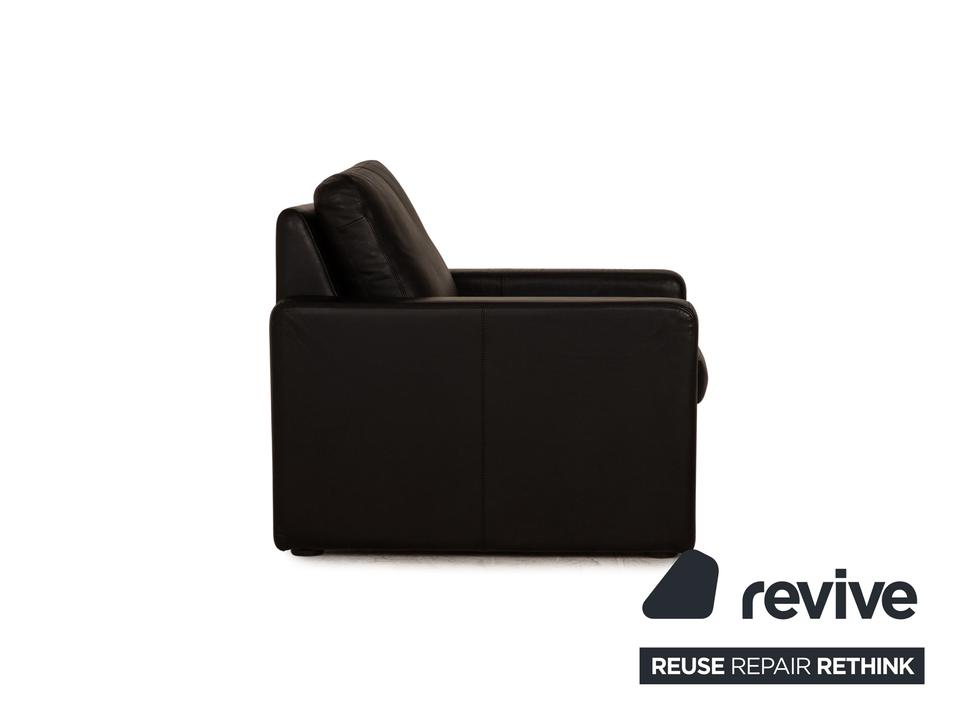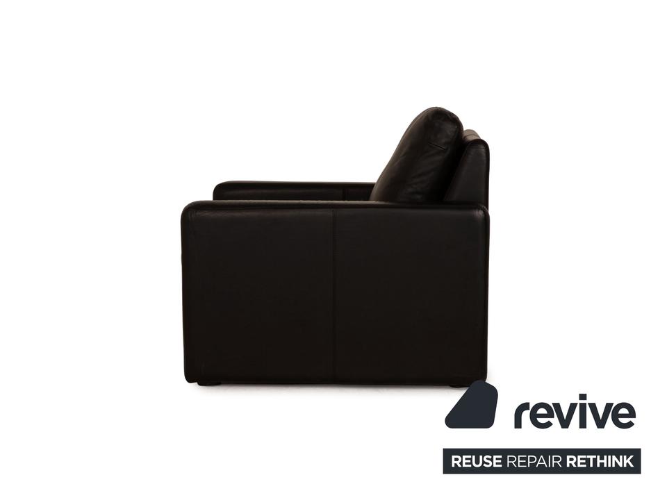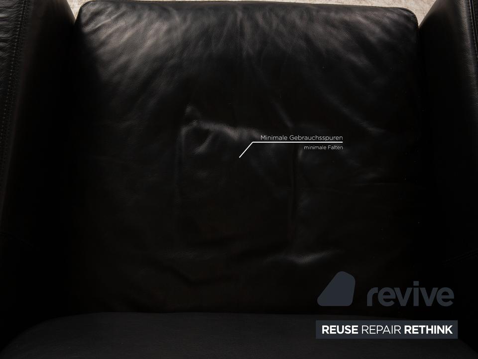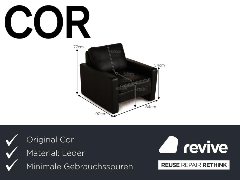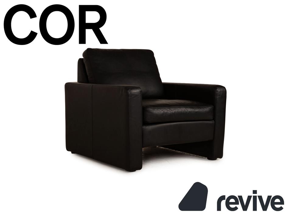 Der Conseta Sessel von Cor ist mit einem schwarzen Echtleder bezogen und steht auf bodentiefen Seitenteilen. Das minimalistische Design und die abgerundete Sitzfläche zeichnen ihn aus.