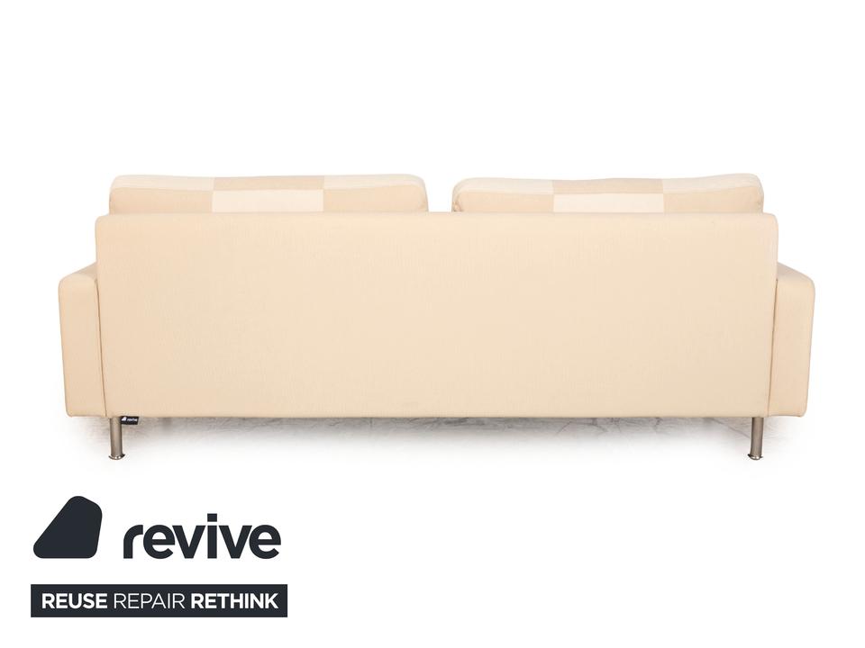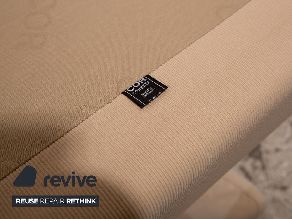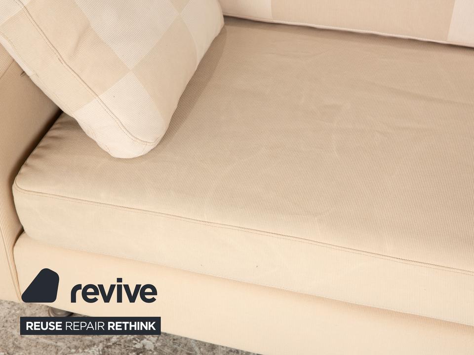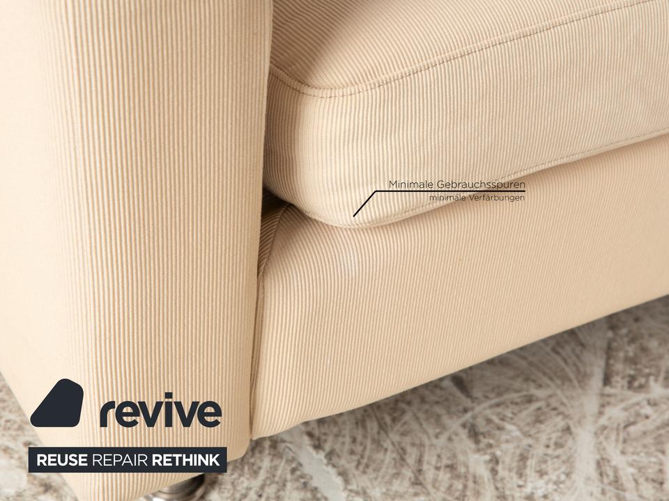 Der Zweisitzer Cor von Conseta ist mit einem cremefarbenen Stoff bezogen und steht auf silbernen Metallfüßen. Er zeichnet sich durch das klassische Design und die schlichte, zeitlose Optik aus.