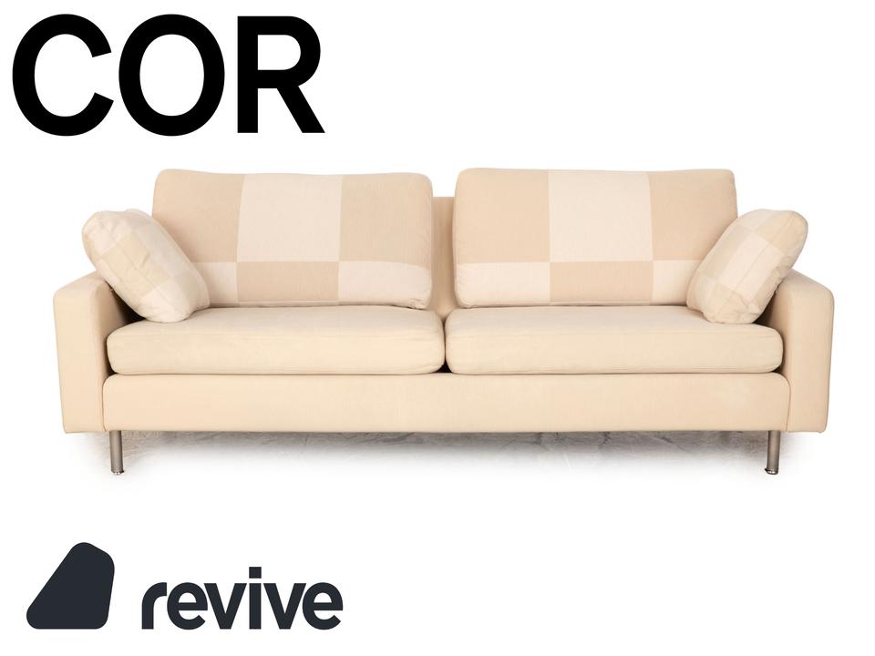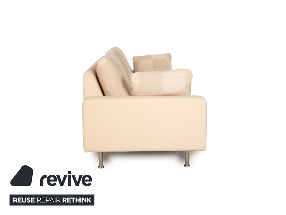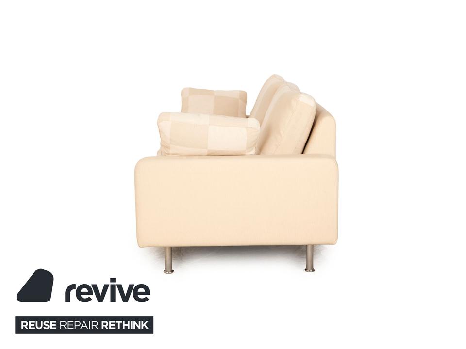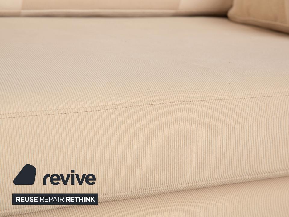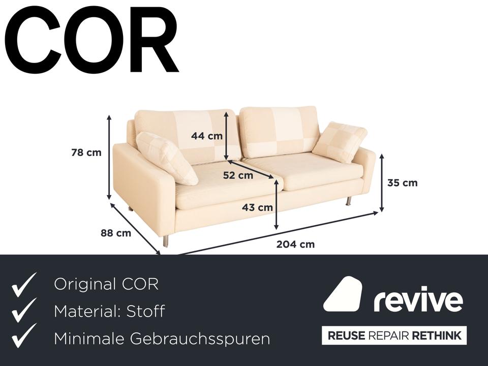 Der Zweisitzer Cor von Conseta ist mit einem cremefarbenen Stoff bezogen und steht auf silbernen Metallfüßen. Er zeichnet sich durch das klassische Design und die schlichte, zeitlose Optik aus.