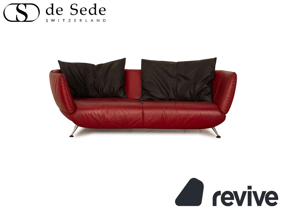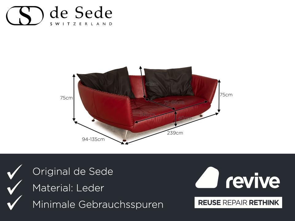 Der Dreisitzer DS 102 von de Sede ist mit einem roten Echtleder bezogen und steht auf schmalen Metallfüßen. Er zeichnet sich durch die großen, schwarzen Rückenkissen und das organische Design aus.Die anthrazitfarbenen Kissen sind von uns angefertigt worden.Das Material ist ein „veganes Leder“.Ein paar Details zum Material:EIN STOFF, SO SCHÖN WIE LEDER, NUR BESSER.Moderner Lifestyle, kompromisslose Qualität und ein Produkt, das auf tierische Bestandteile verzichtet. Das ist Gavin, unser veganer Möbelstoff und eine echte Alternative zum Polster-Leder.Obwohl er optisch und haptisch sehr stark an Leder erinnert, so ist er diesem funktional weitaus überlegen. Durch seine High-Tech-Faser ist Gavin mit 100.000 Scheuertouren nicht nur unglaublich strapazierfähig, sondern – anders als Leder – auch angenehm atmungsaktiv. Für einen hervorragenden Sitzkomfort und außergewöhnliche Langlebigkeit. Die umfangreiche Palette an Farben bietet eine Vielfalt an Möglichkeiten zur individuellen Gestaltung Ihrer Wohn(t)räume. Mit Gavin entscheiden Sie sich für einen Möbelstoff der neuen Generation – höchste Qualitätsansprüche vereint mit einer modernen und gleichzeitig tierfreundlichen Lebensweise.