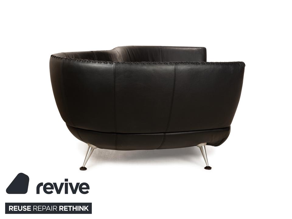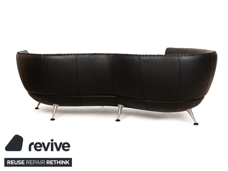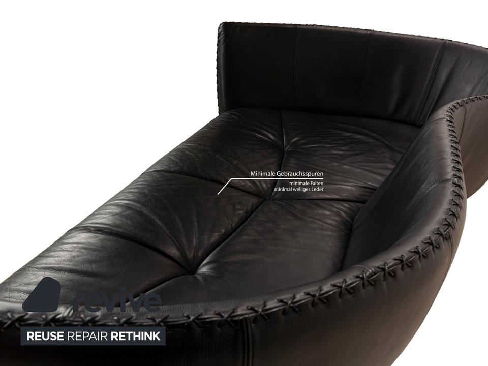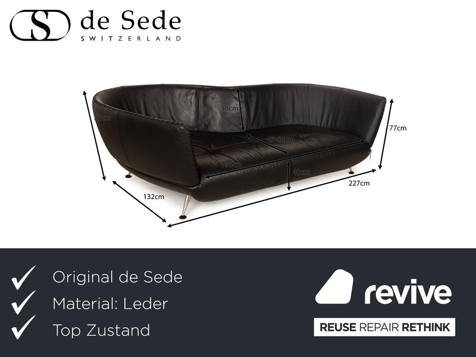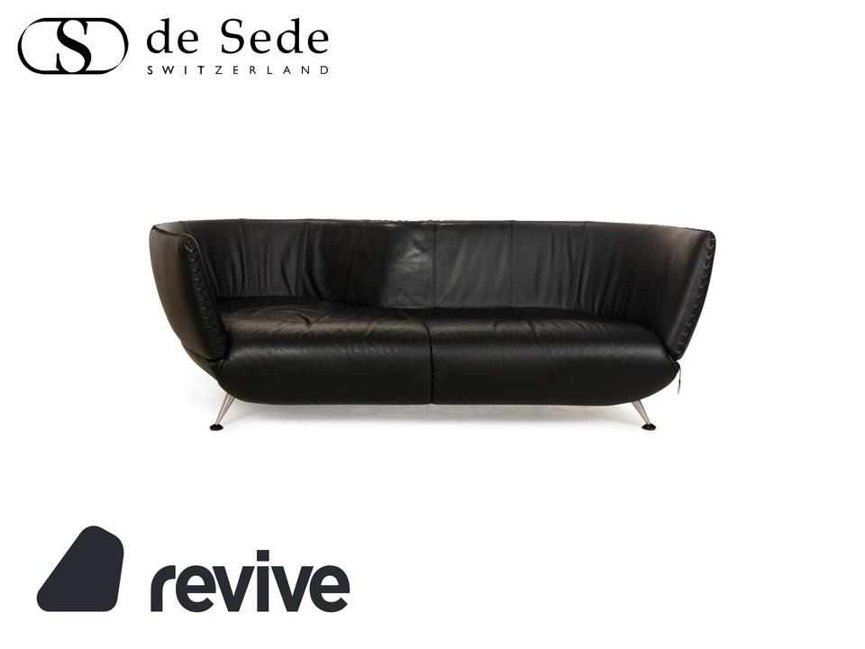 Der Dreisitzer DS-102 von de Sede ist mit einem schwarzem Leder bezogen und vollkommen von diesem ummantelt. Das Sofa auf silbernen, leicht winklig abstehenden Metallfüßen. Er zeichnet sich durch die organische Form und das extravagante Design aus. Eine auffällige Naht entlang der Kanten sorgt auch für Spannung im Detail. Exzellentes Qualitätshandwerk und zeitloses Design gehen hier Hand in Hand.