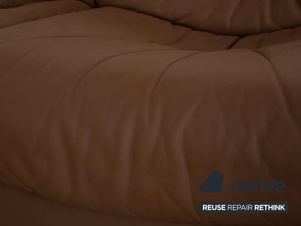Das Ecksofa von de Sede ist mit einem braunen Echtleder bezogen und steht auf schlichten Füßen. Die Couch zeichnet sich durch ihre rundliche Form und das schlichte, zeitlose Design aus.