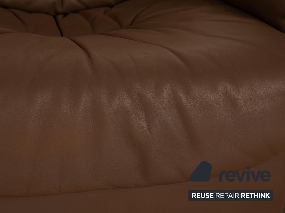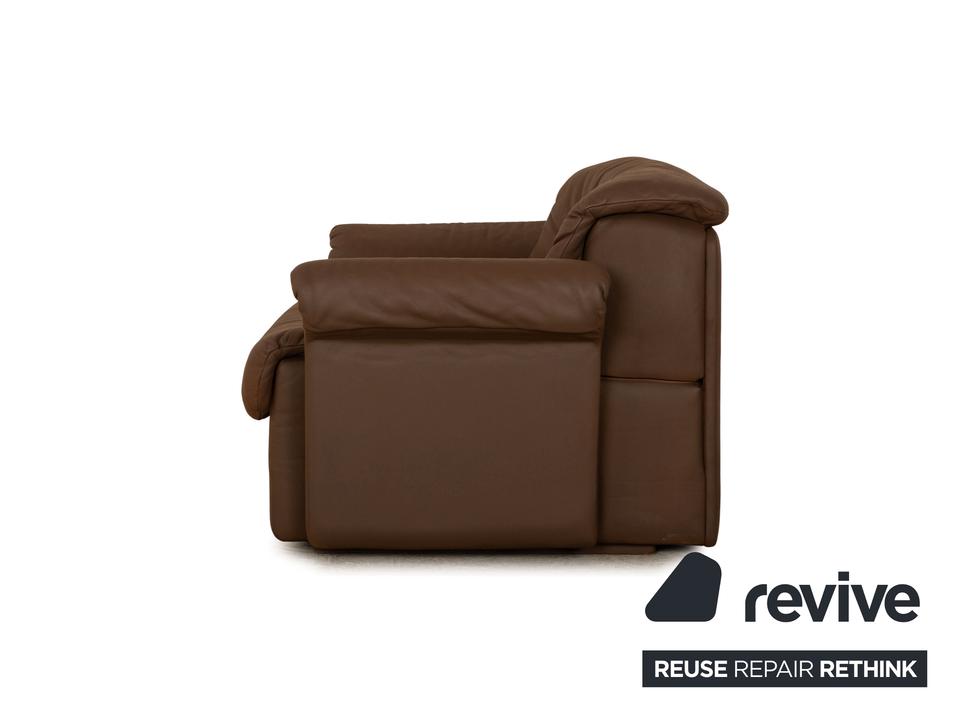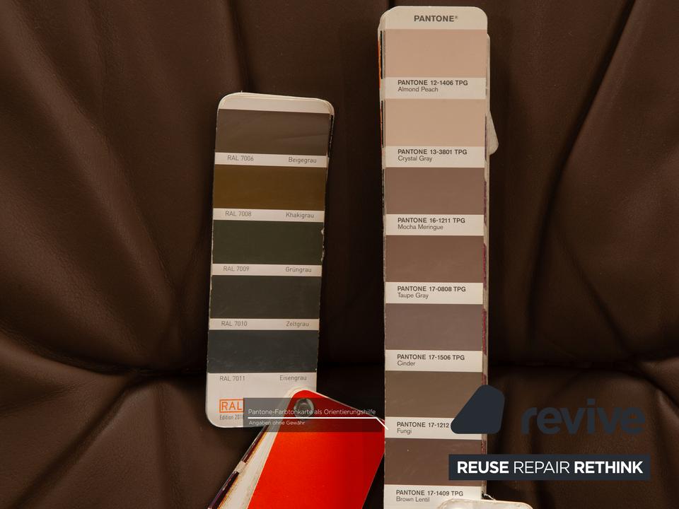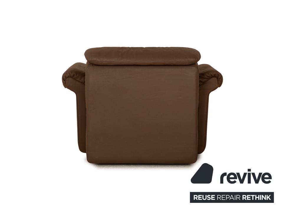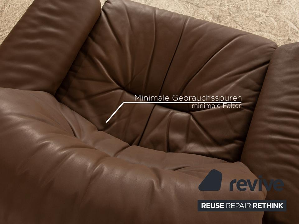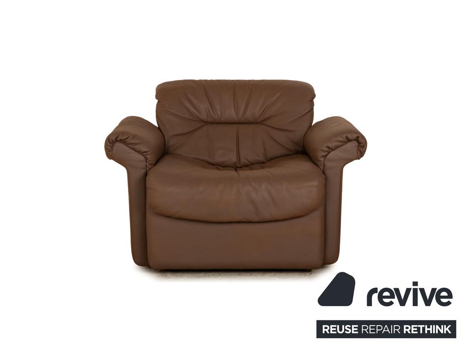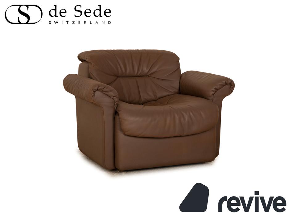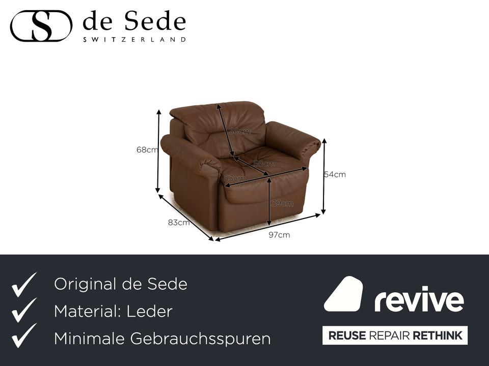Der Sessel von de Sede ist mit einem braunen Echtleder bezogen und steht auf schlichten Füßen. Er zeichnet sich durch die rundliche Form und das schlichte, zeitlose Design aus.