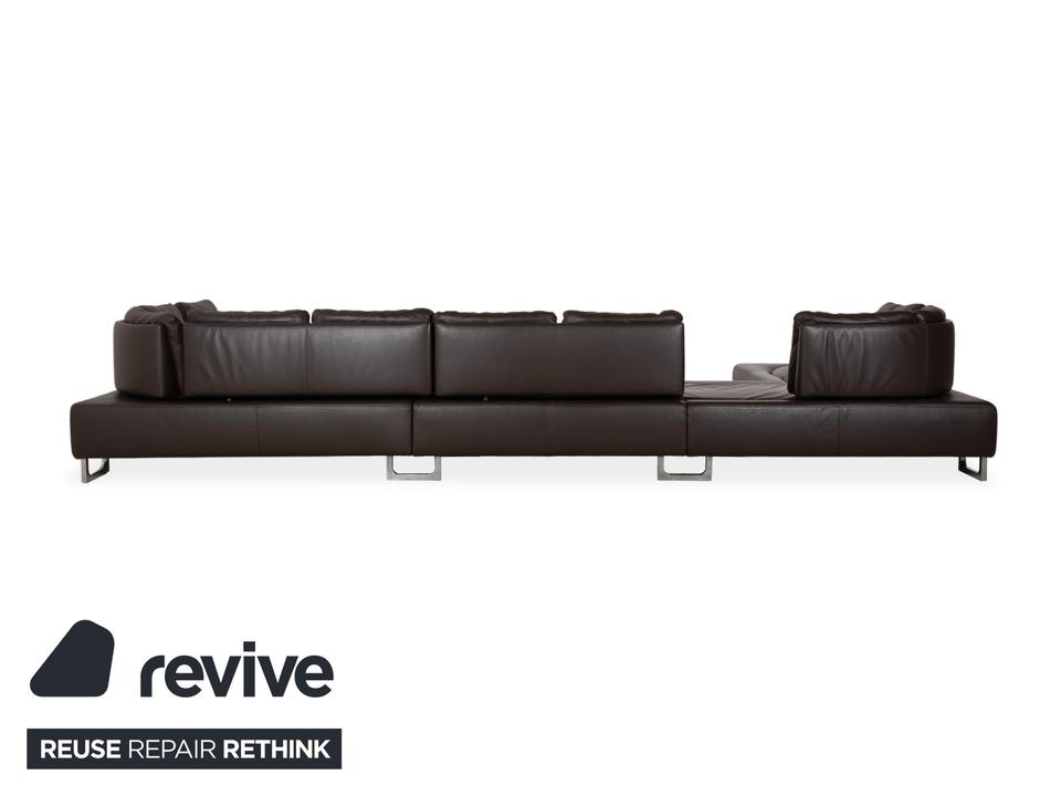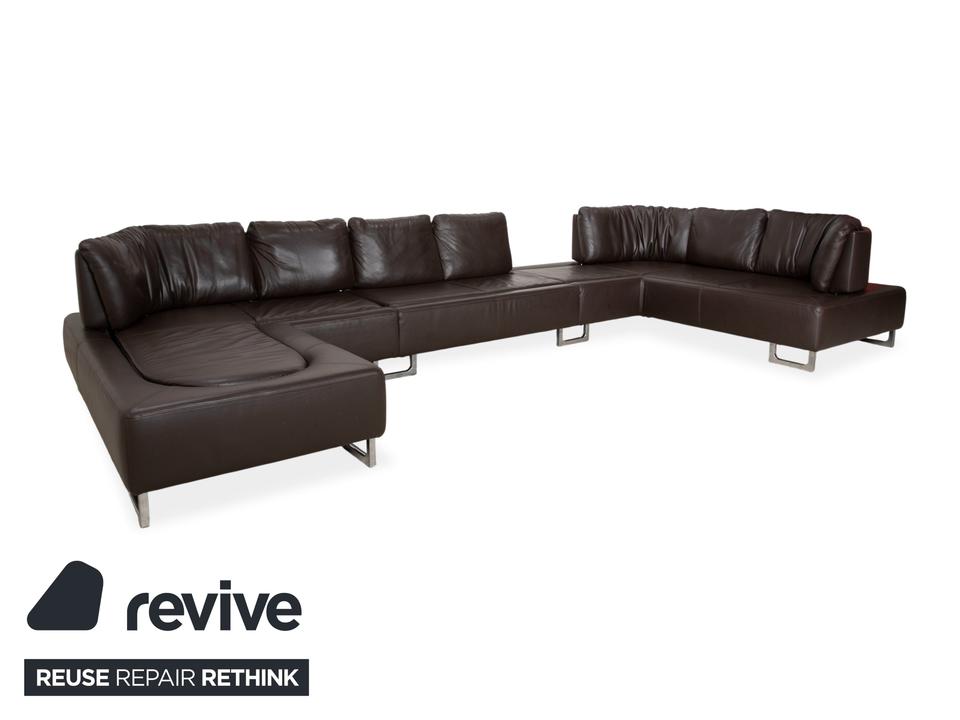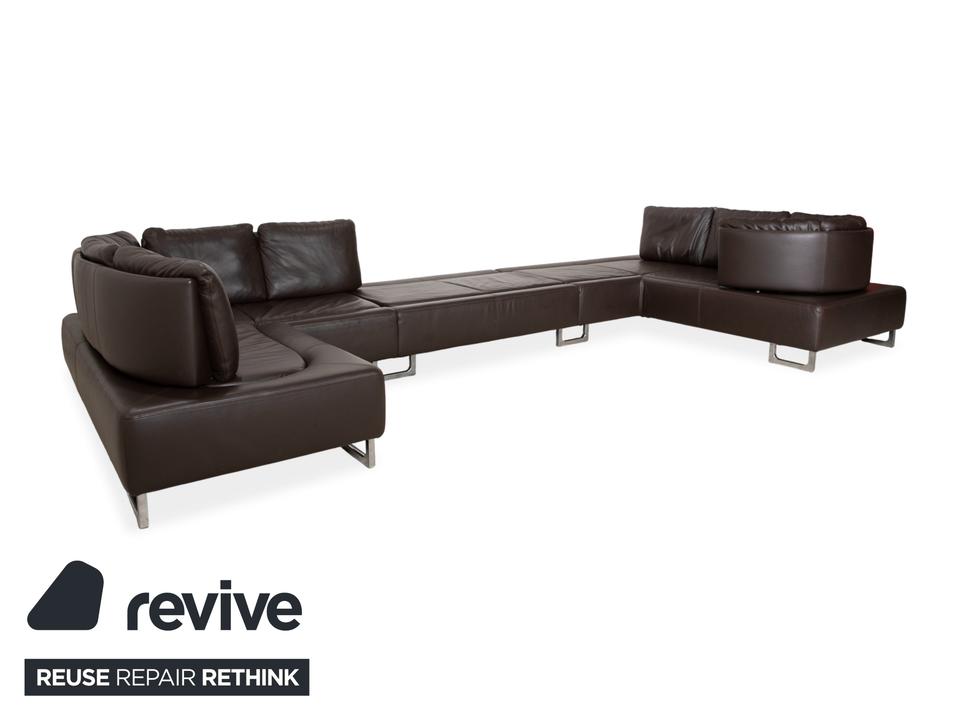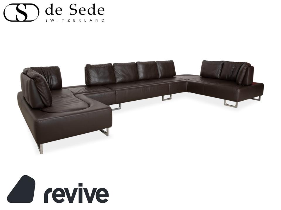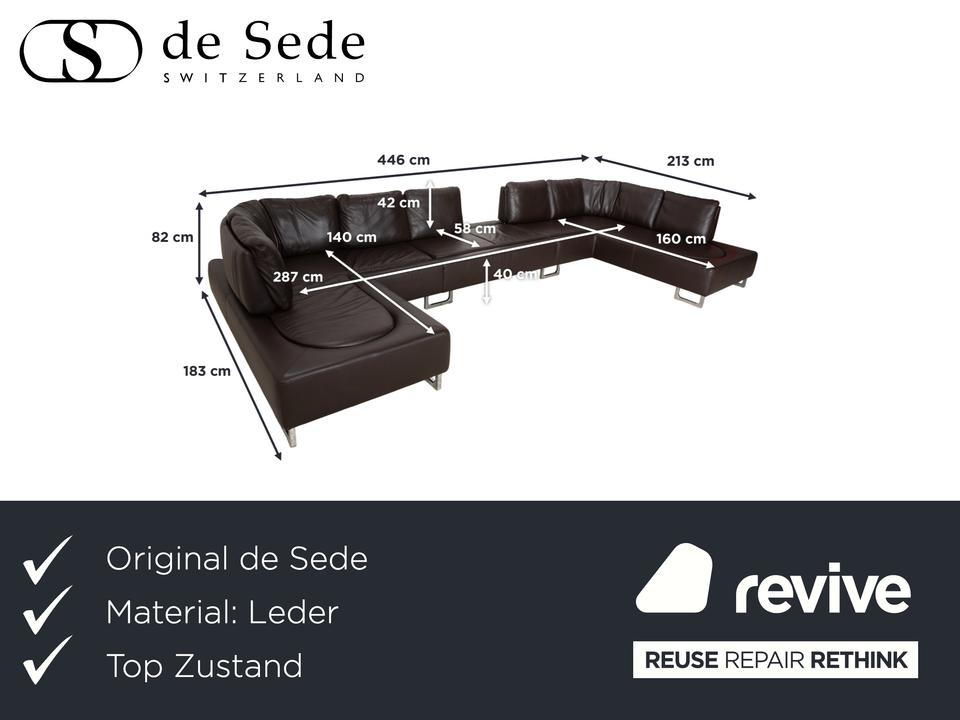 Das Modell DS-165, entworfen von Hugo de Ruiter, ist weit mehr als nur ein Sofa: es ist eine Wohnlandschaft, die Schweizer Handwerkskunst neu definiert. Das Herzstück dieses Designs ist die innovative 360-Grad-Funktion: Die Rückenlehnen lassen sich manuell entlang der Kurven der großzügigen Plattform verschieben. So kann die Sitzposition immer wieder neu ausgerichtet werden: für das Heimkino, mal als kommunikative Runde oder als offene Wohnlandschaft. Mit einer Rückenhöhe von 45 cm (aufgesetzt) bietet das Sofa genau den richtigen Halt, ohne den Blick durch den Raum zu versperren.Der Bezug aus sattem, dunkelbraunem Leder ist ein haptisches Erlebnis: Das charakteristische, dicke de Sede Leder ist griffig, robust und dennoch handschuhweich. Ein besonderes Augenmerk liegt auf dem Fundament: Die markanten Kufenfüße bestehen aus alupoliertem Metall, das einen schönen Akzent mit dem dunklen Leder bildet. Sie verleihen dem massiven Volumen nicht nur eine schwebende Leichtigkeit und einen glänzenden Kontrast, sondern sind auch durchdacht ausgestattet: Dank integrierter Gleiter ist diese Design-Ikone besonders schonend zu Parkettboden.Diese Konfiguration besteht aus drei Elementen, die viel Platz zum Entfalten bieten:Anbauteil Links: Breite 147 cm | Tiefe 182 cm | Höhe 84 cmAnbauteil Mitte: Breite 187 cm | Tiefe 25 cm* | Höhe 45 cmAnbauteil Rechts: Breite 162 cm | Tiefe 212 cm | Höhe 84 cm