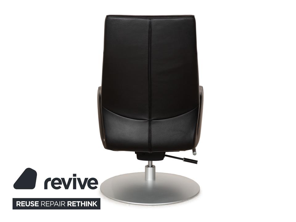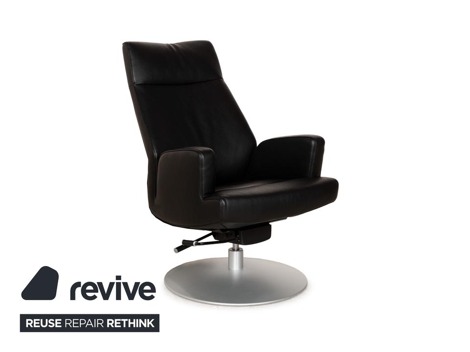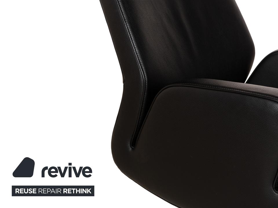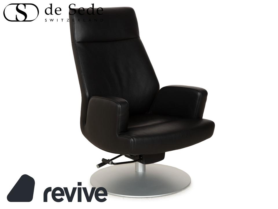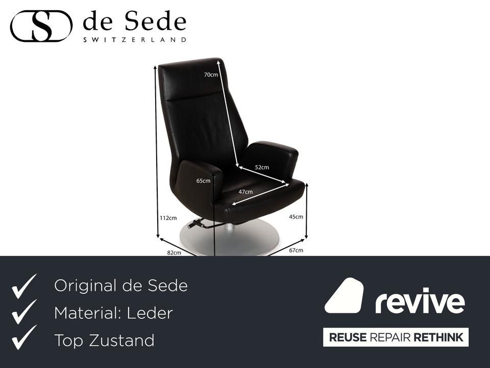Der Sessel DS-256 von de Sede ist mit schwarzem Leder bezogen und steht auf einem silbernen Metallteller. Er kann in der Höhe verstellt und leicht nach hinten gekippt werden. Die Materialien Metall und Leder gehen hier mit ihren kühlen Farbtönen eine elegante Verbindung ein, die sich optisch leicht mit weiteren Einrichtungsgegenständen kombinieren lässt. Der Hersteller ist bekannt für seine exzellente Verarbeitung, so dass mit diesem Sessel formschönes Handwerk nach Hause kommt. Die Sitzhöhe lässt sich über eine Gadruckfeder verstellen.Minimale Sitzhöhe: 40 cmMaximale Sitzhöhe: 45 cm