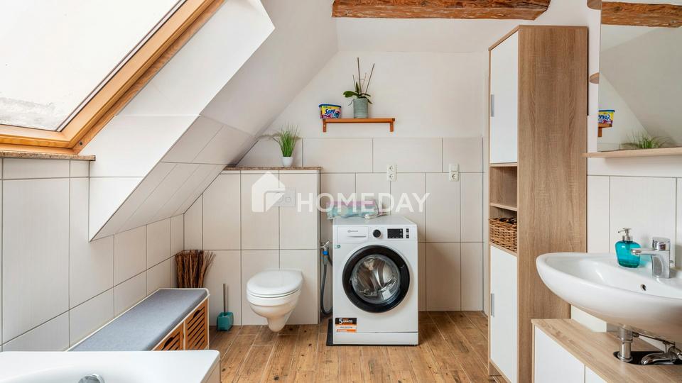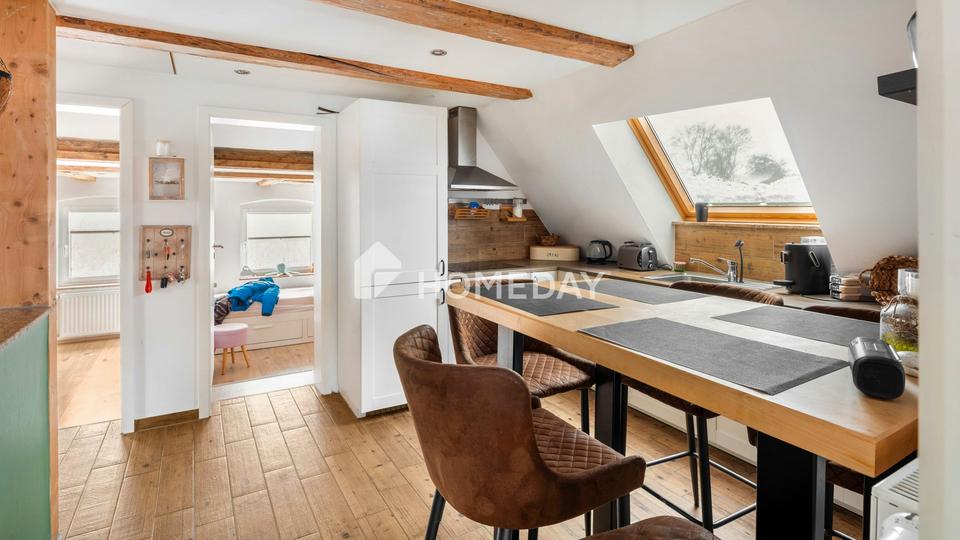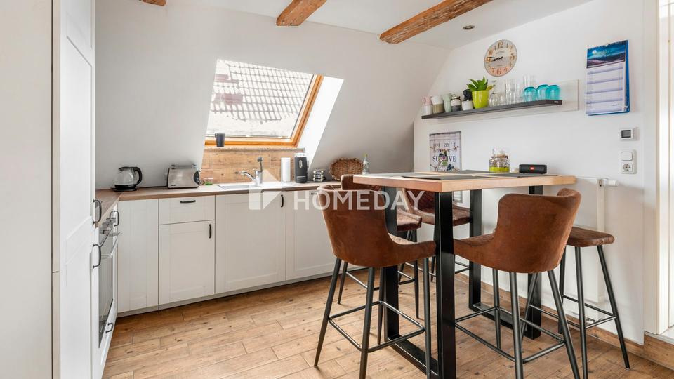 Im Inneren entsteht eine besondere Atmosphäre durch sichtbare Holzbalken, die Wärme und einen authentischen Charakter vermitteln. Die Kombination aus historischen Details und moderner Ausstattung sorgt für ein stimmiges Gesamtbild, das sowohl Mieter als auch Eigennutzer anspricht.