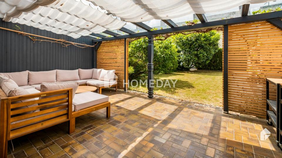 Der pflegeleichte, schön gestaltete Garten bietet ausreichend Platz für die Familie. Die sonnige Terrasse ist nach Süd-Westen ausgerichtet. Hier lässt es sich bequem entspannen.