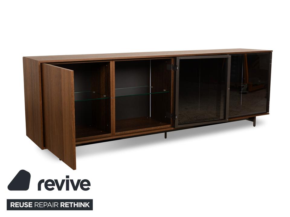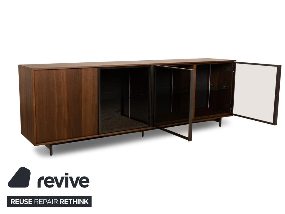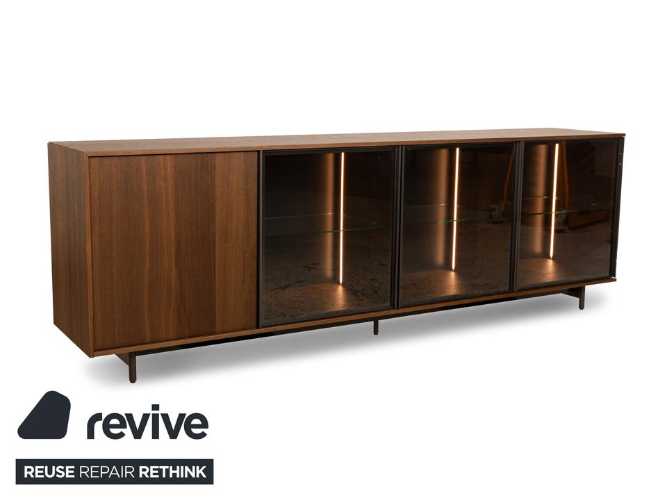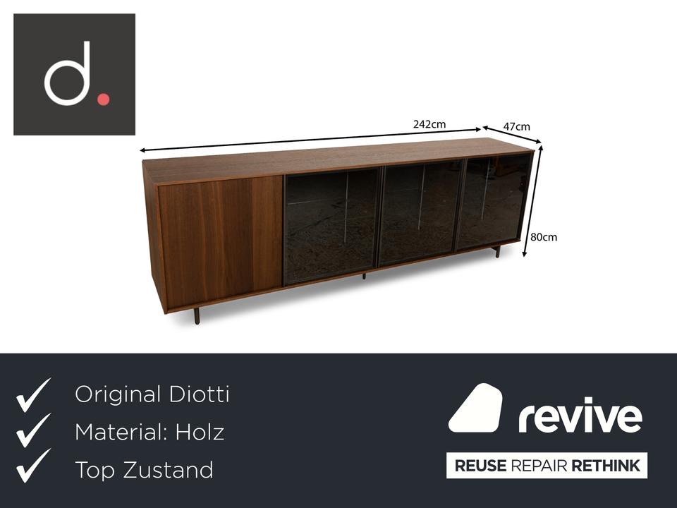 Das Sideboard von Diotti ist aus dunkelbraunem Holz und Glas gefertigt und steht auf einem eleganten Metallgestell. Das schlichte, geometrische Design wird getoppt durch die elektrische Innenbeleuchtung. Hinter drei Glas- und einer Holztür befinden sich durch Glastrennböden aufgeteilte Fächer, die Stauraum für alles bieten, was man mit der Beleuchtung auch zur Schau stellen möchte.