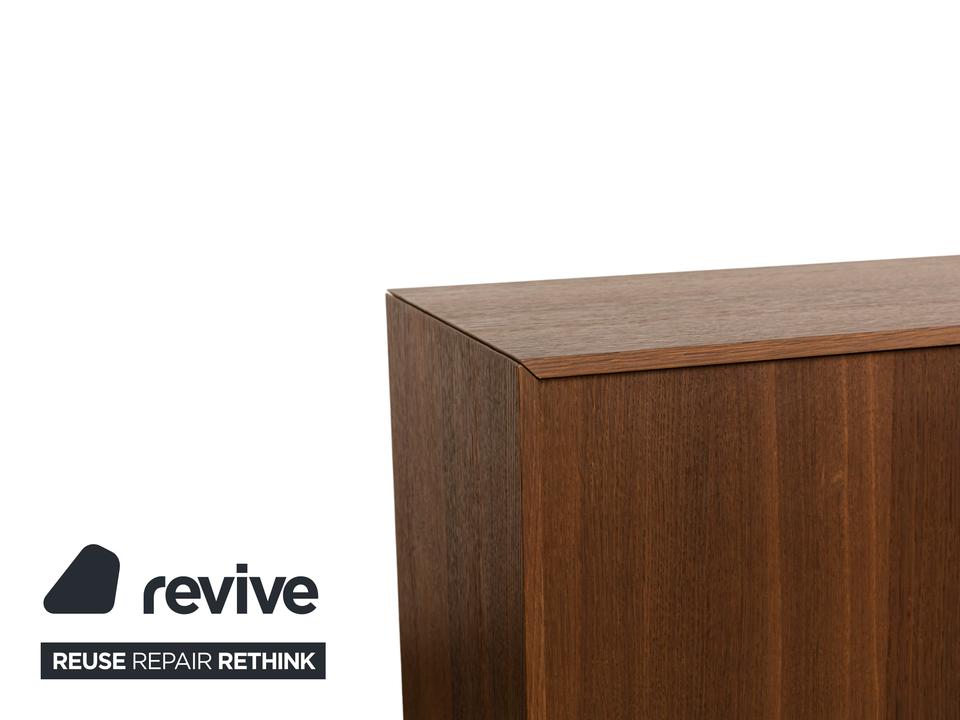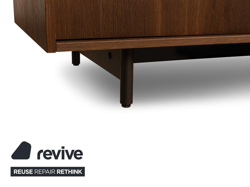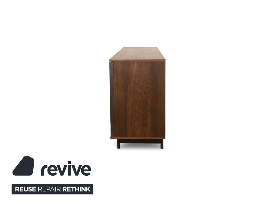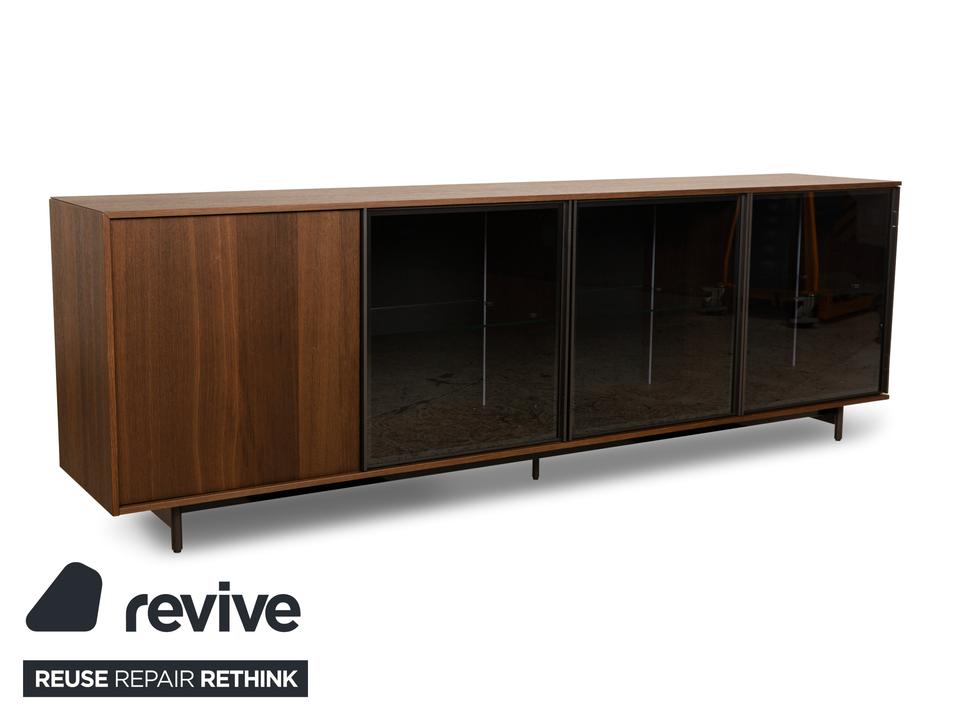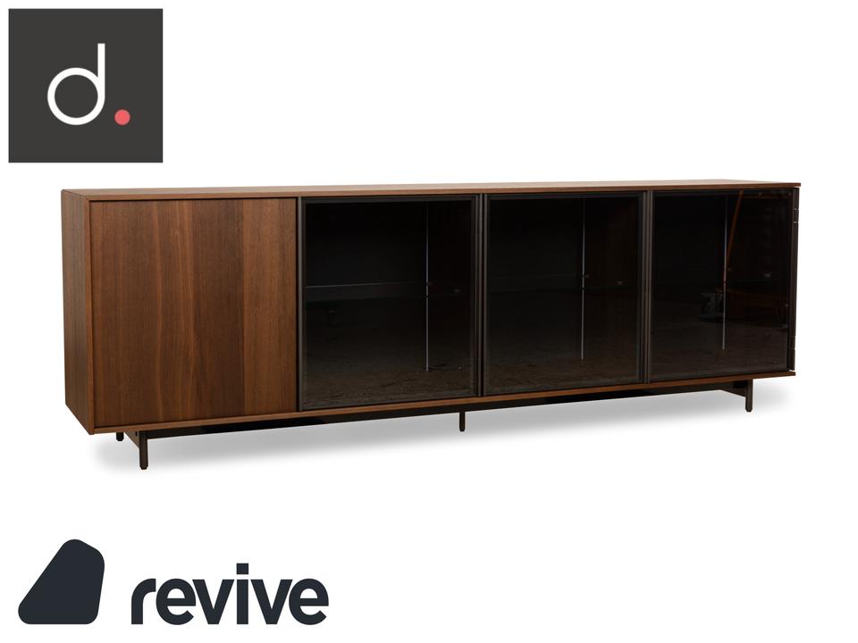 Das Sideboard von Diotti ist aus dunkelbraunem Holz und Glas gefertigt und steht auf einem eleganten Metallgestell. Das schlichte, geometrische Design wird getoppt durch die elektrische Innenbeleuchtung. Hinter drei Glas- und einer Holztür befinden sich durch Glastrennböden aufgeteilte Fächer, die Stauraum für alles bieten, was man mit der Beleuchtung auch zur Schau stellen möchte.