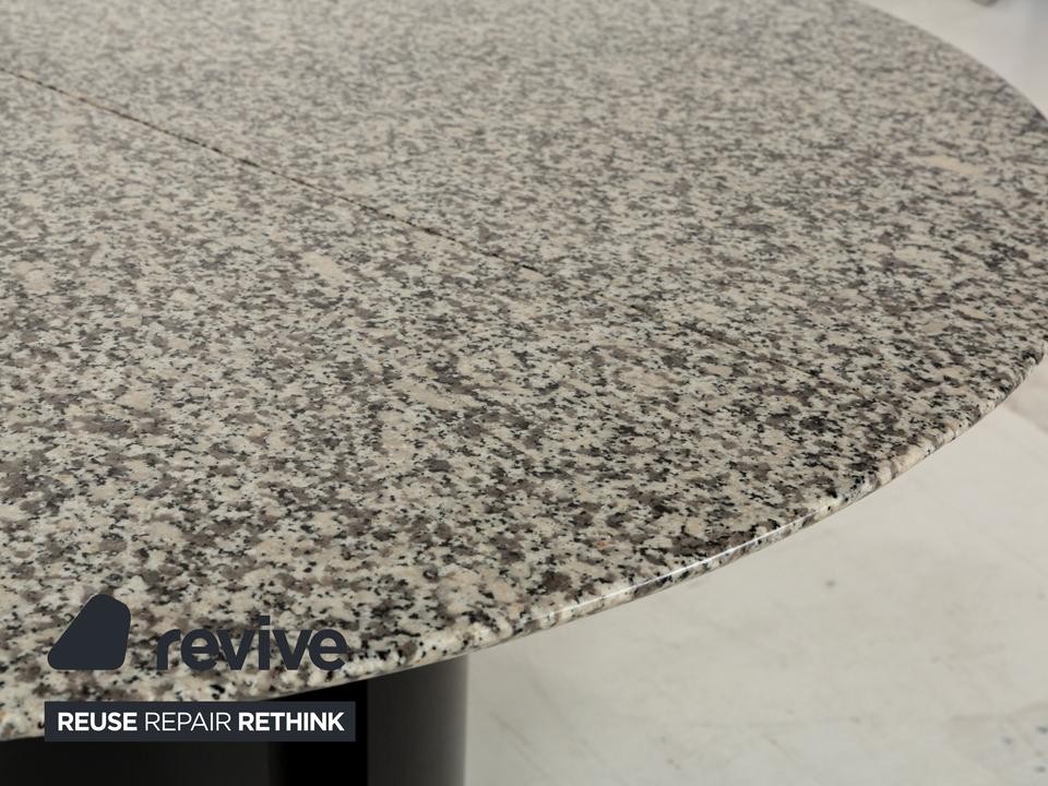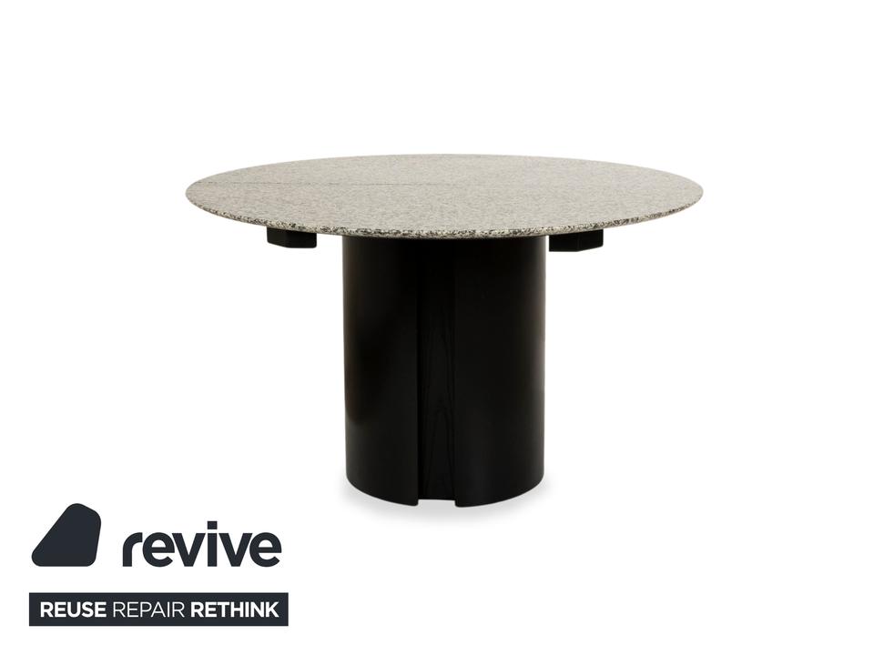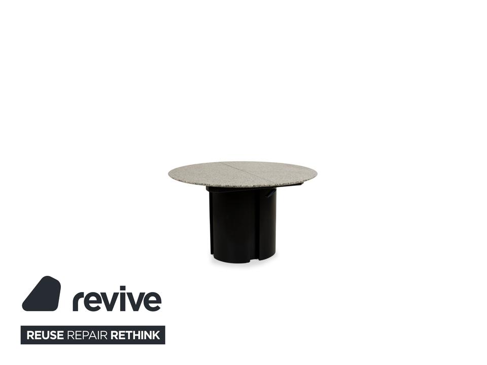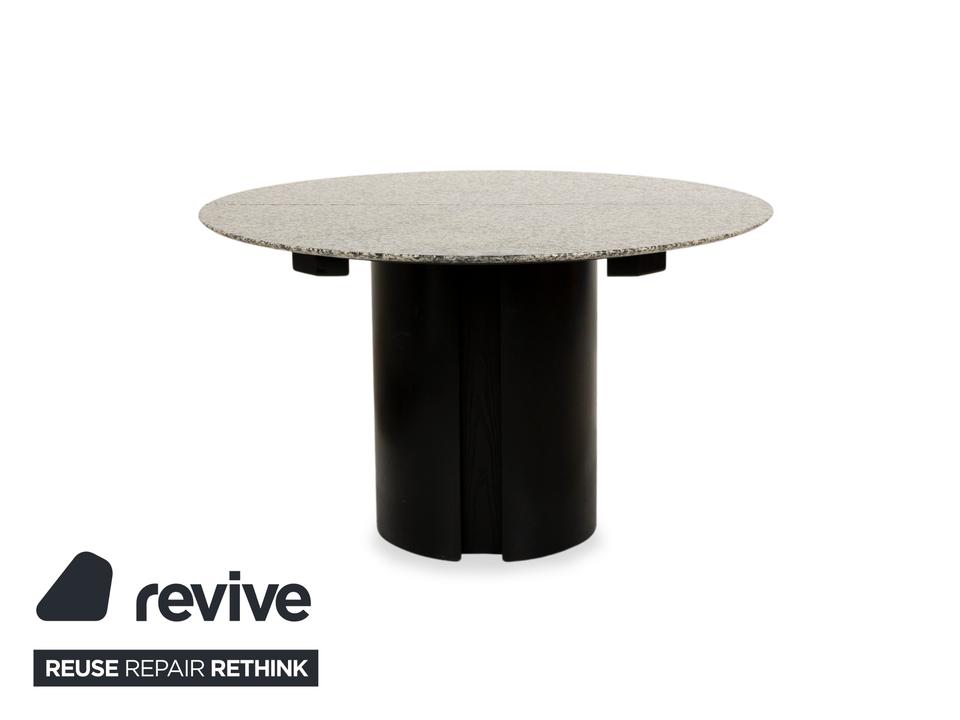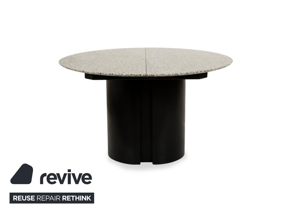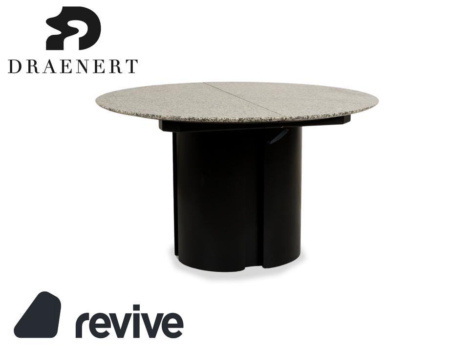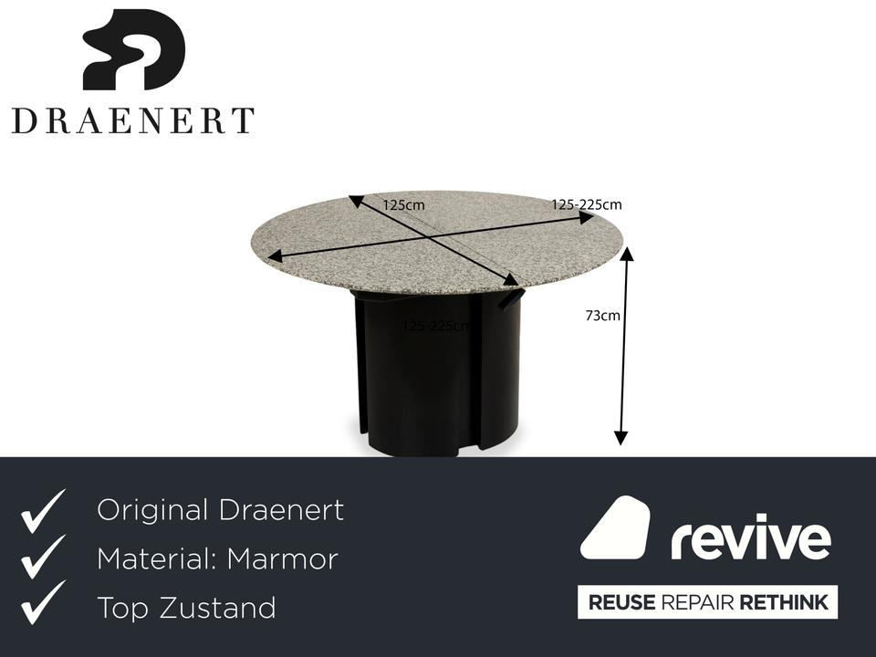 Der Esstisch Draenert 1226 aus Marmor besticht durch sein klassisches Design. Die Marmorplatte und der Mechanismus zum Erweitern der Tischfläche von 125cm auf 225m ruhen auf einem schwarzen Holzsockel, der die Runde Grundform des Tischs spiegelt.