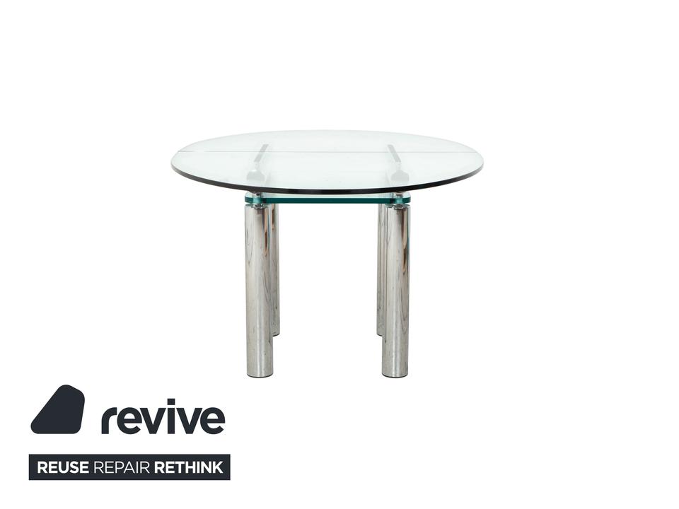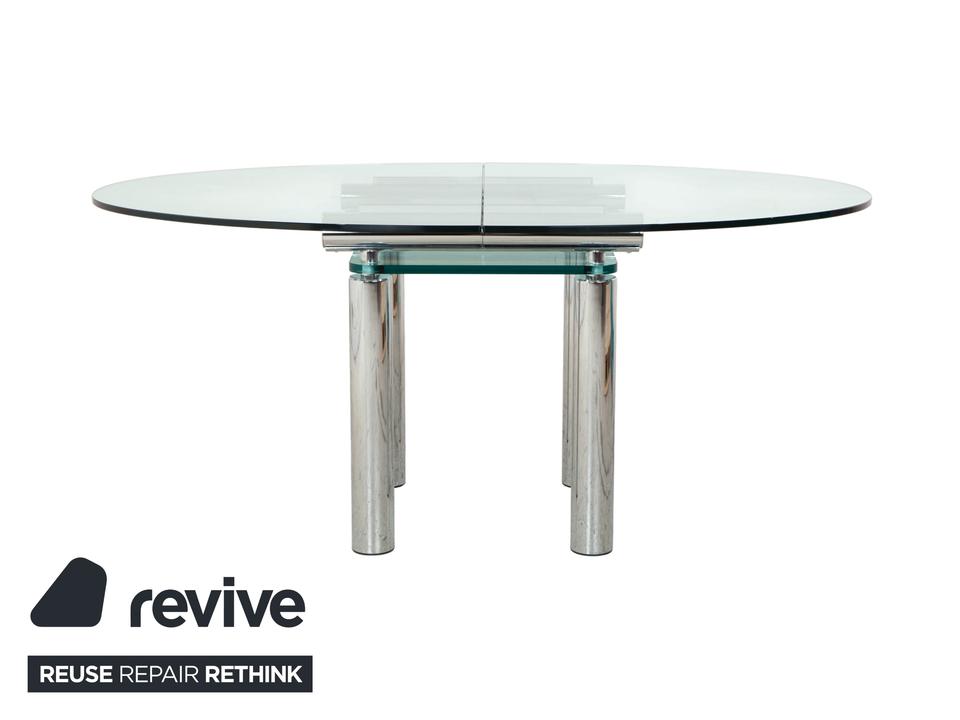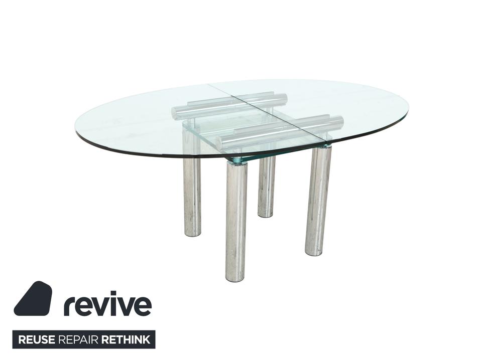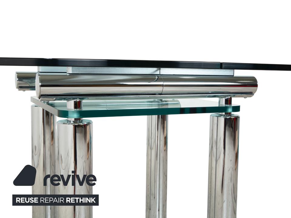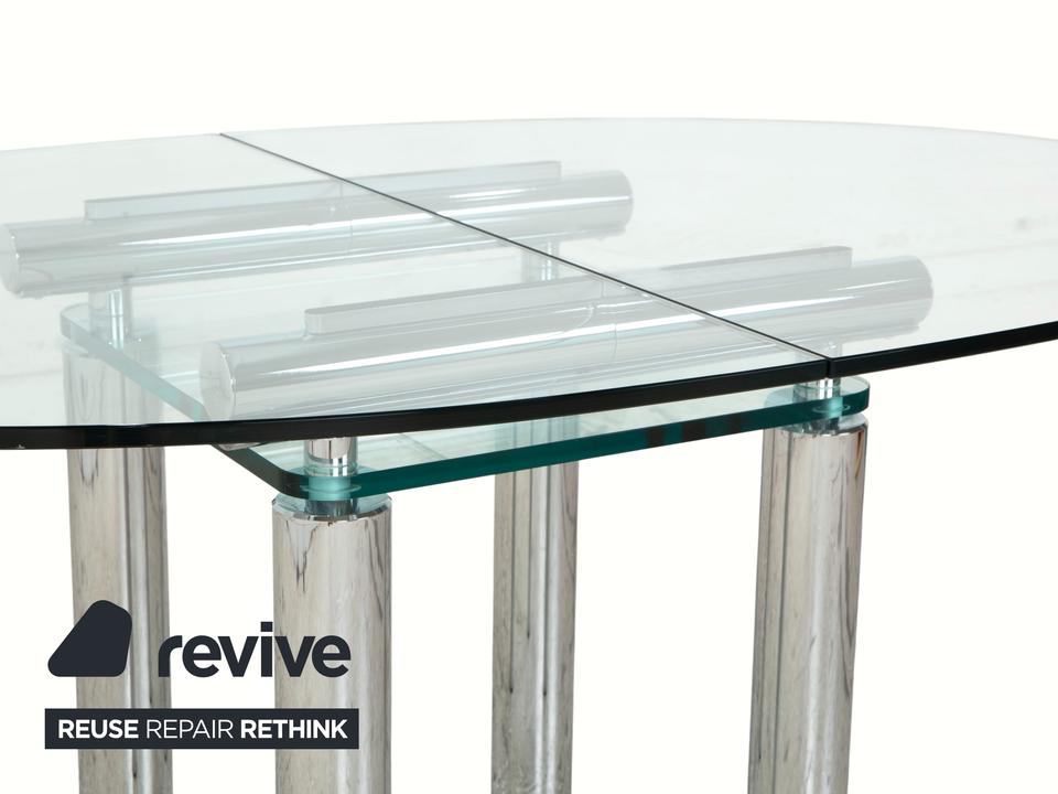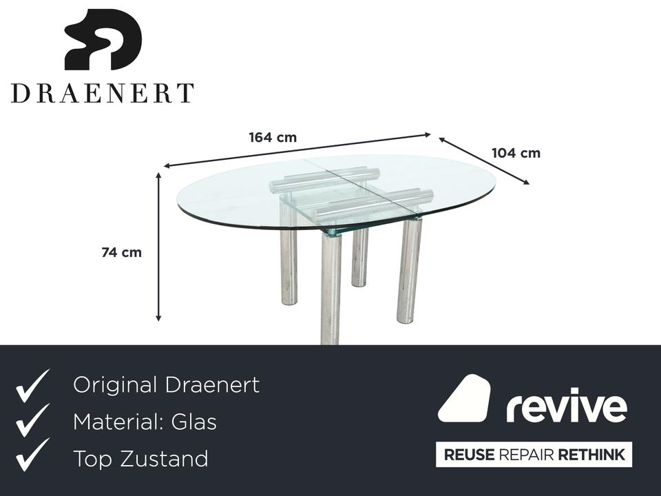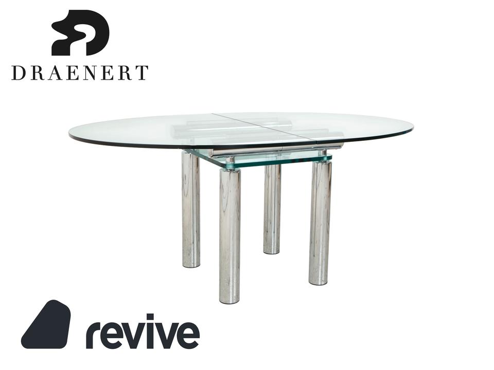 Hinweis: Die Ausziehfunktion wurde stillgelegt. Der Esstisch ist entsprechend wie abgebildet und nicht ausziehbar.Der Esstisch stammt aus der renommierten Manufaktur Draenert. Als moderner Design-Klassiker verleiht er deinem Essbereich eine luxuriöse Leichtigkeit. Durch seine Transparenz dominiert er den Raum nicht, sondern lässt ihn atmen und wirken.Das Design lebt von spannenden Kontrasten: Die Platte aus massivem Klarglas scheint förmlich auf den vier kräftigen Säulenfüßen in glänzendem Silber (Chrom-Optik) zu schweben. Die sichtbare Technik unter der Glasplatte ist dabei ein bewusstes Design-Element, das die hochwertige Verarbeitung zelebriert.