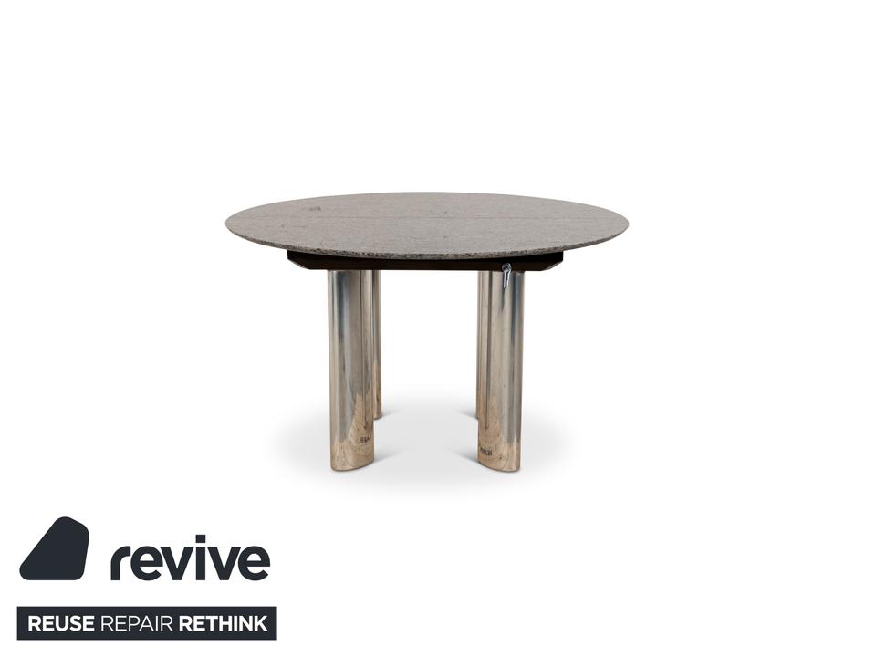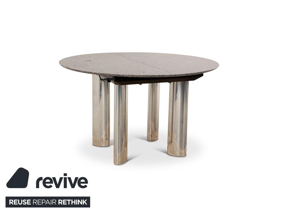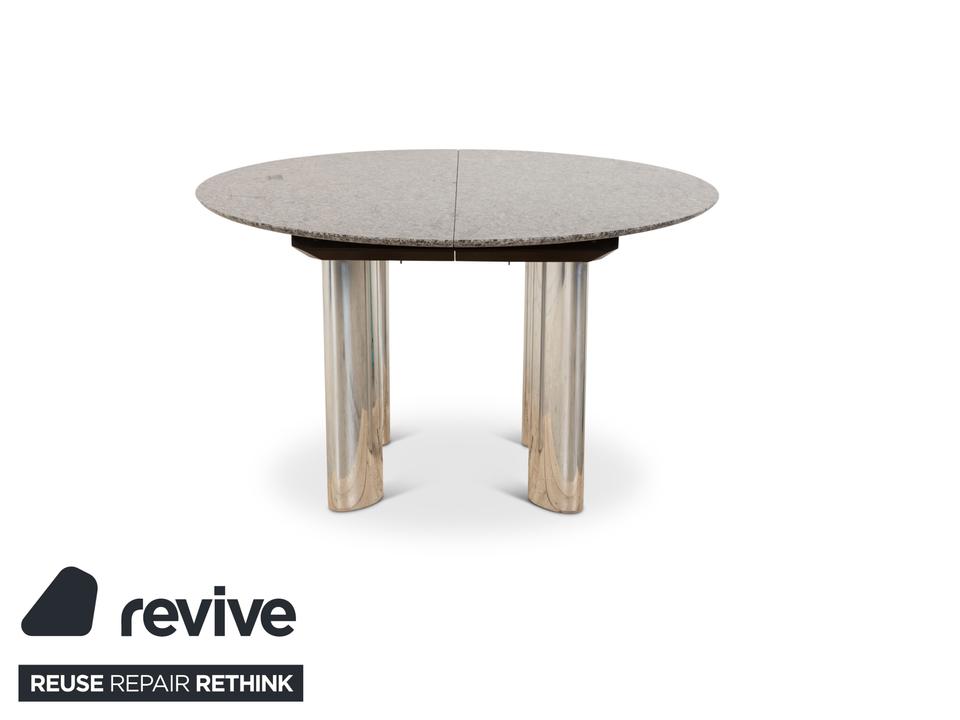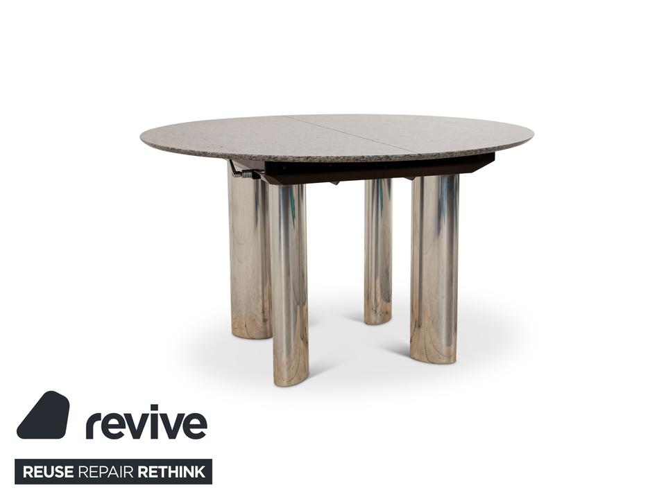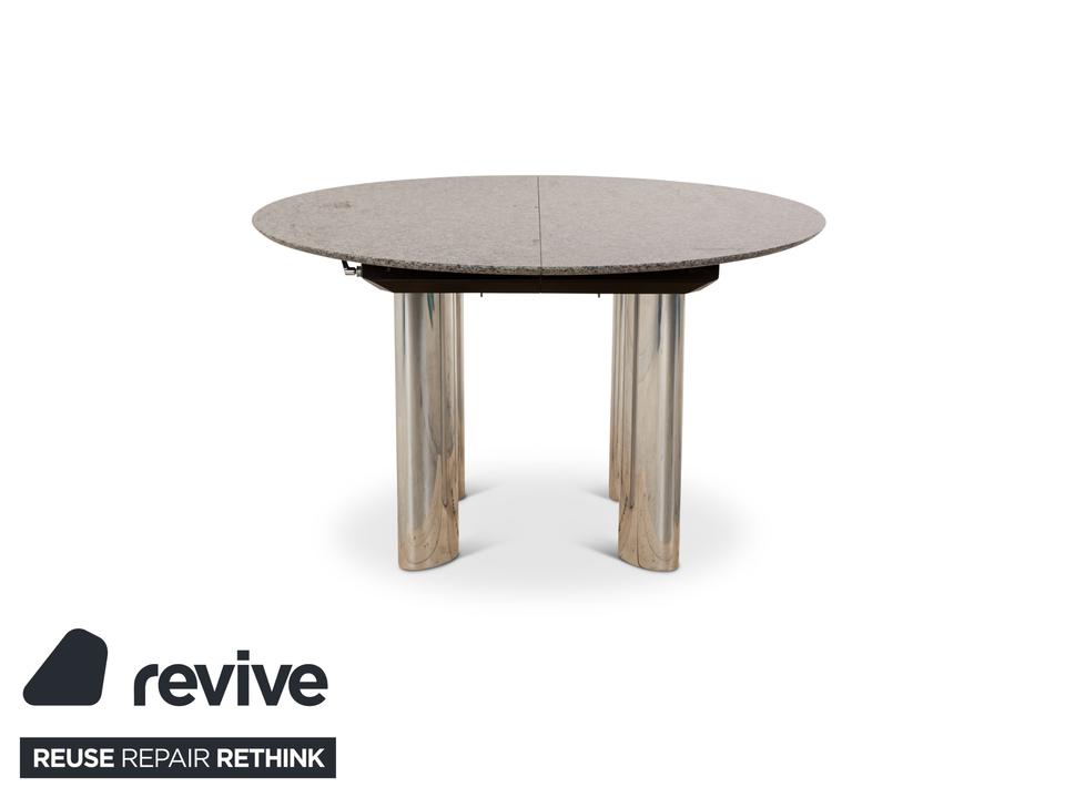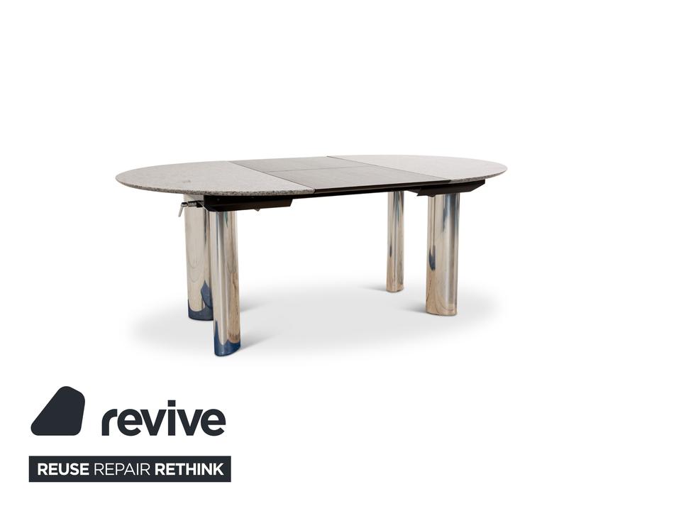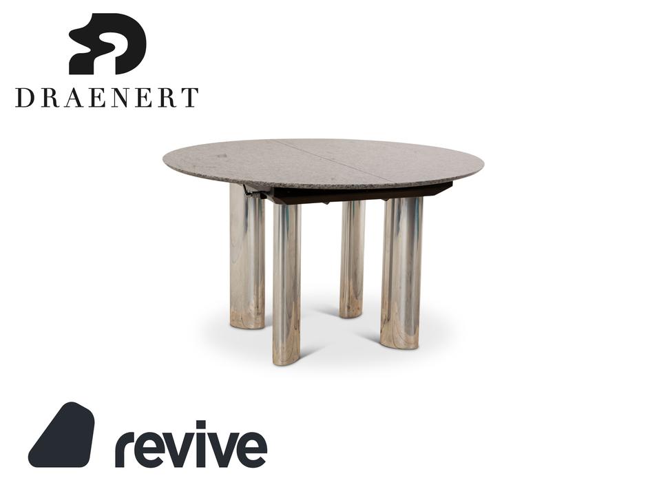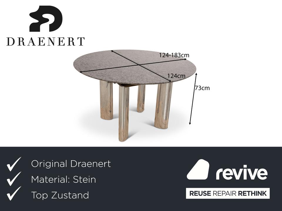 Der Esstisch von Draenert ist aus einer Steinplatte mit Erweiterungsfunktion gefertigt, die auf metallischen Beinen in extravaganter Grundform montiert ist. Durch wenige Handgriffe lässt sich die Tischbreite von 124cm auf 183cm erweitern – so ist Platz für die ganze Familie!