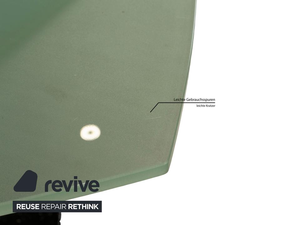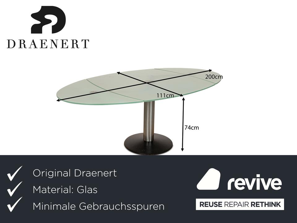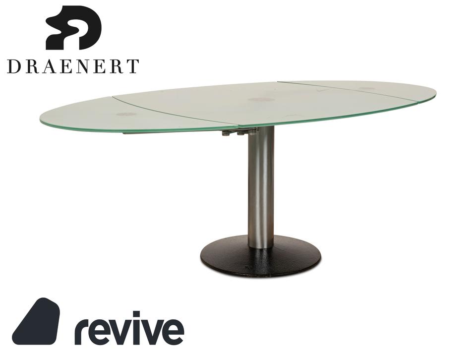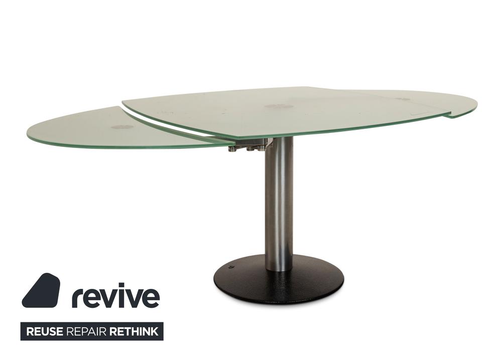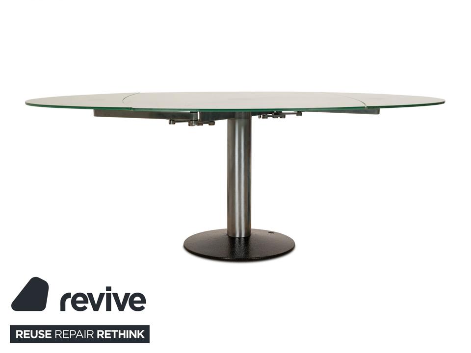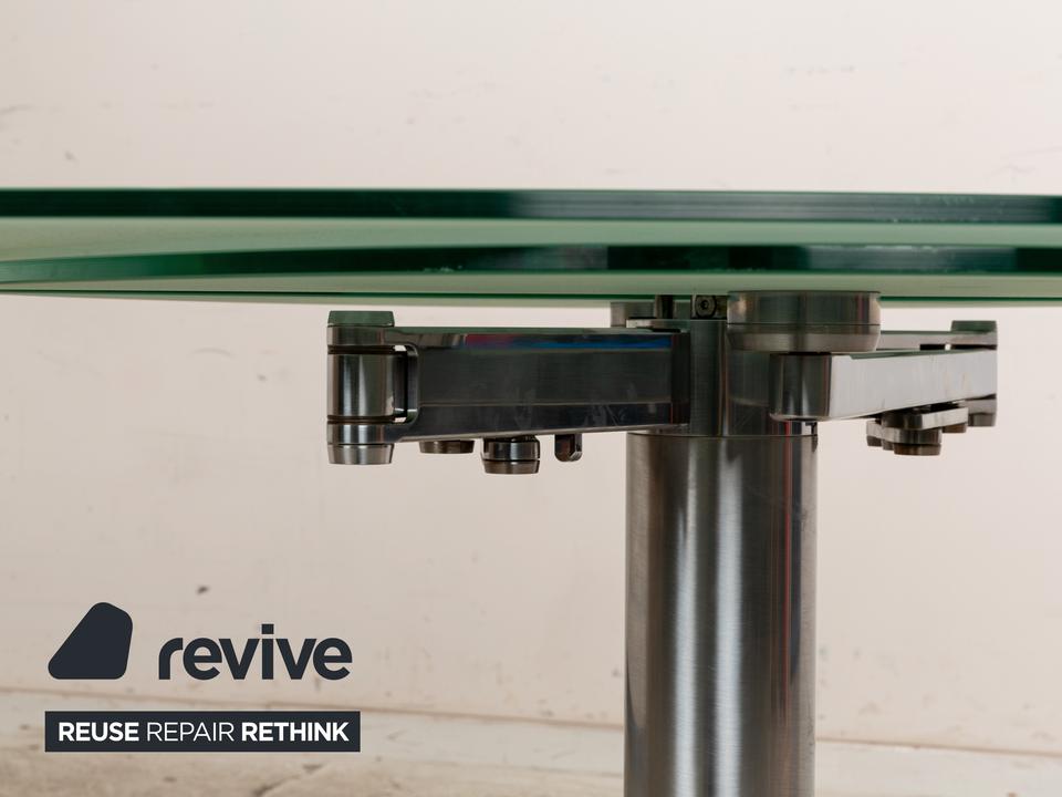 Der Esstisch Titan von Draenert besteht aus einer Glasplatte und steht auf einem silbernen Fuß. Er zeichnet sich durch das stilvolle Design und die gelungene Kombination der Materialien Metall und Glas aus.