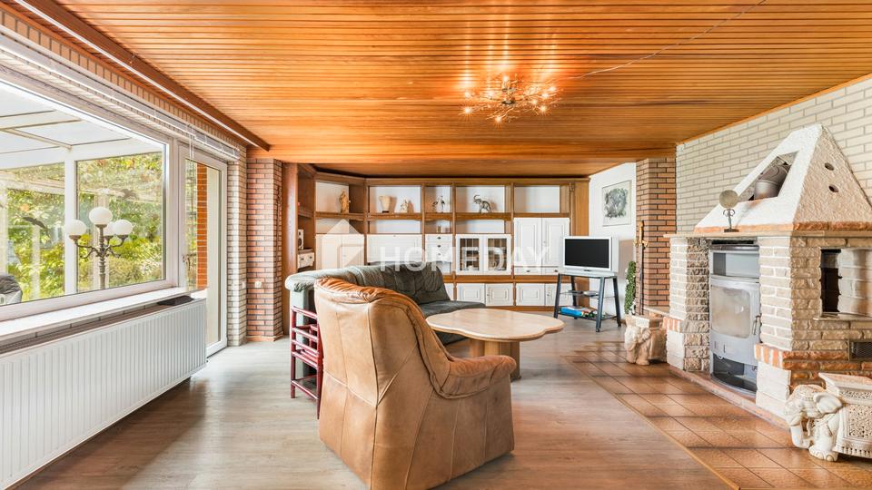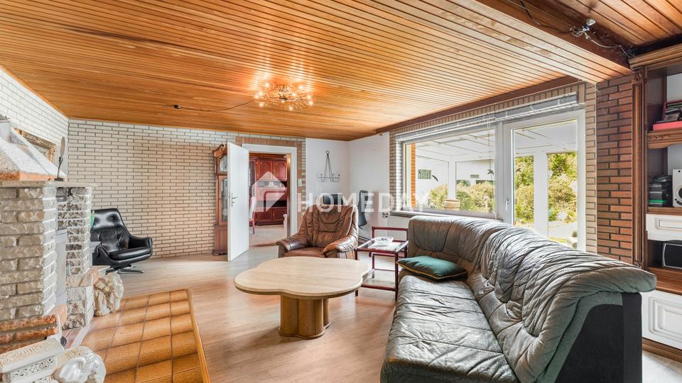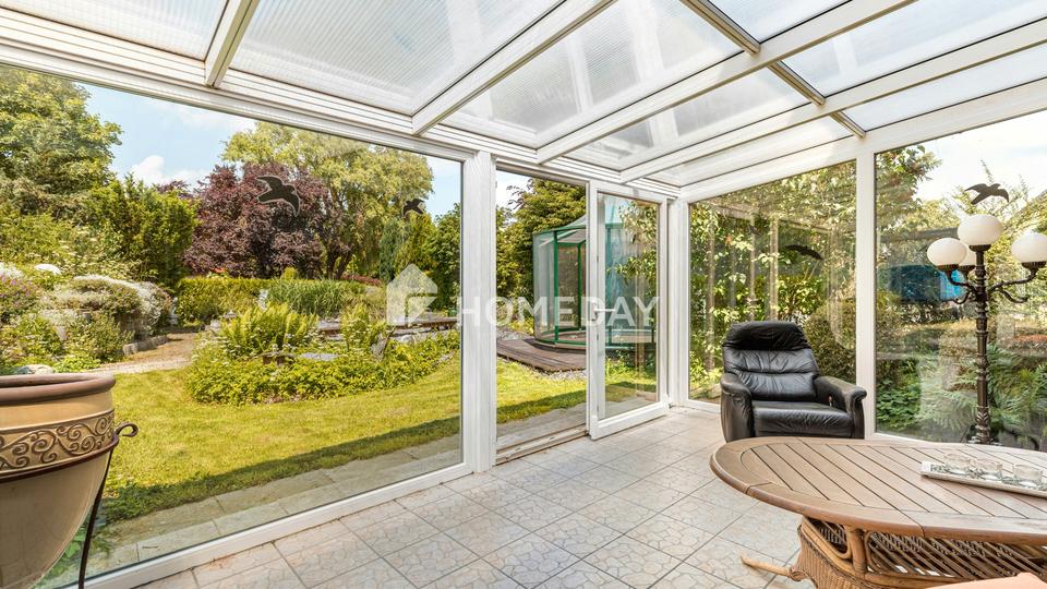 Im Erdgeschoss empfängt Sie ein großzügiges, lichtdurchflutetes Wohnzimmer mit Kamin, das besonders in den kühleren Monaten eine gemütliche Wohnatmosphäre schafft. Der angrenzende Wintergarten mit Blick in den Garten ist nach Norden ausgerichtet und bildet eine perfekte Verbindung zwischen Wohnraum und Natur – ideal für entspannte Lesestunden oder den Frühstückskaffee mit Grünblick.