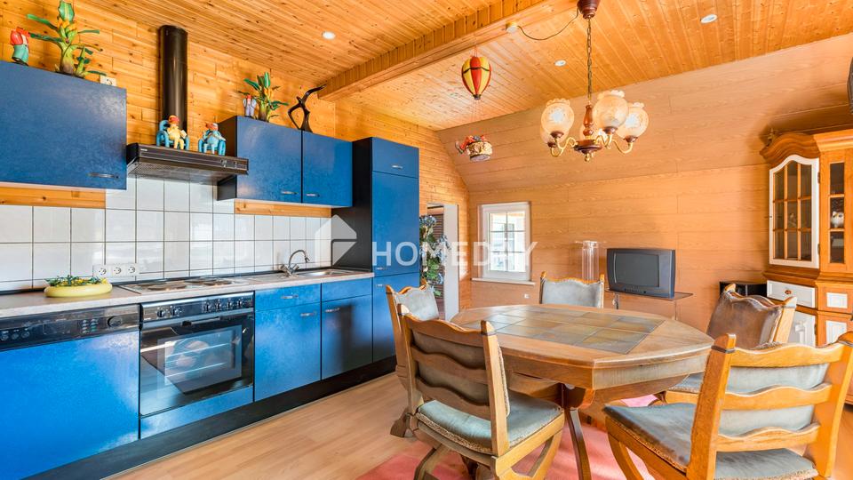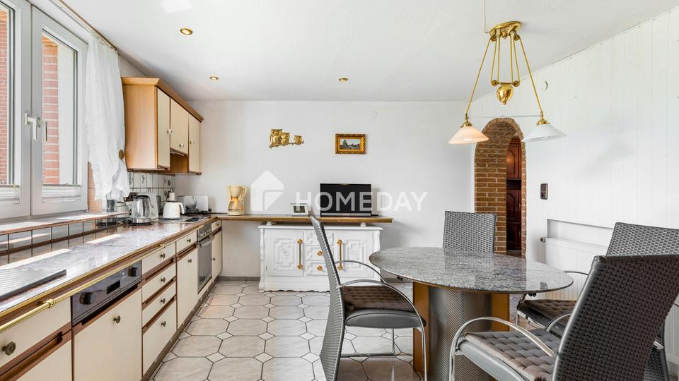 Die Küche ist mit einer Einbauküche ausgestattet und bietet Platz für kulinarische Ideen. Zusätzlich stehen ein Esszimmer, ein Tageslichtbad mit Badewanne und Waschmaschinenanschluss, zwei Abstellräume sowie ein Heizungsraum zur Verfügung. Der Werkraum mit Zugang zur nach Süden ausgerichteten Terrasse bietet kreative Nutzungsmöglichkeiten – ob als Atelier, Hobbywerkstatt oder geschützter Rückzugsort.