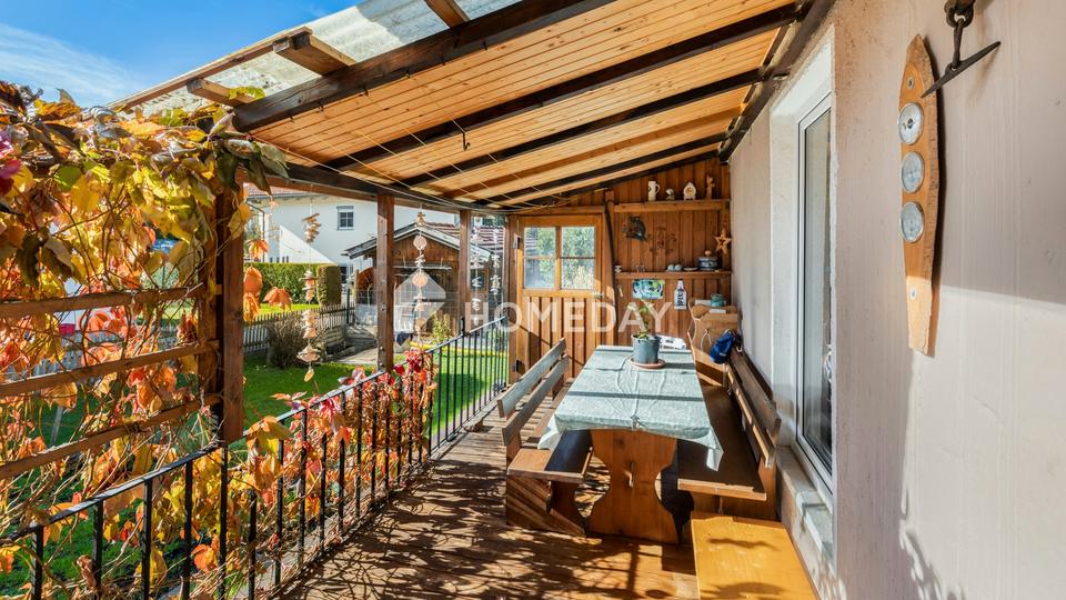 Der Außenbereich präsentiert sich ebenso einladend. Der weitläufige Garten wirkt mit seiner grünen Weite, den gepflegten Beeten und dem Gartenhäuschen wie eine private Oase. Der Geräteschuppen erweitert die praktischen Nutzungsmöglichkeiten und unterstreicht den funktionalen Charakter des Anwesens. Die Terrasse lädt zu entspannten Stunden im Freien ein, während der Garagenstellplatz den täglichen Komfort ergänzt.