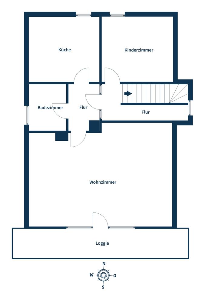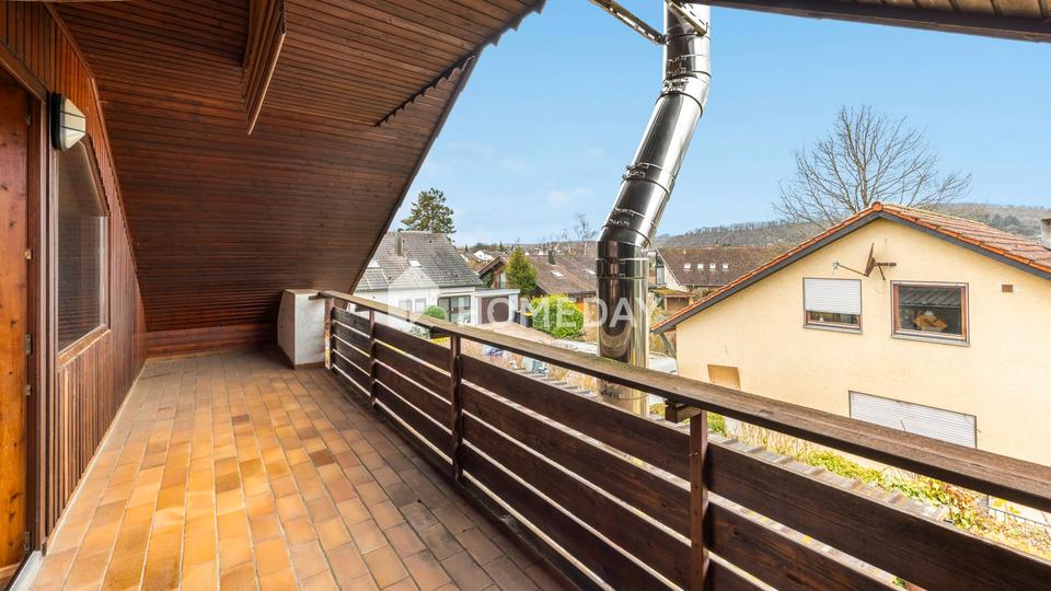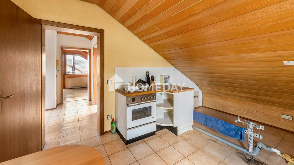 Über die Treppe erreichen Sie das Obergeschoss, das als eigenständige zweite Wohneinheit konzipiert ist. Die Raumaufteilung bietet ein großzügiges Wohnzimmer mit Zugang zur Loggia, ein Schlafzimmer, ein weiteres Zimmer, das sich als Büro oder Kinderzimmer anbietet, eine separate Küche sowie ein Badezimmer und eine zusätzliche Toilette. Die sichtbare Holzdecke und die Dachschrägen verleihen dieser Einheit Charakter und schaffen eine wohnliche Atmosphäre mit besonderem Flair.