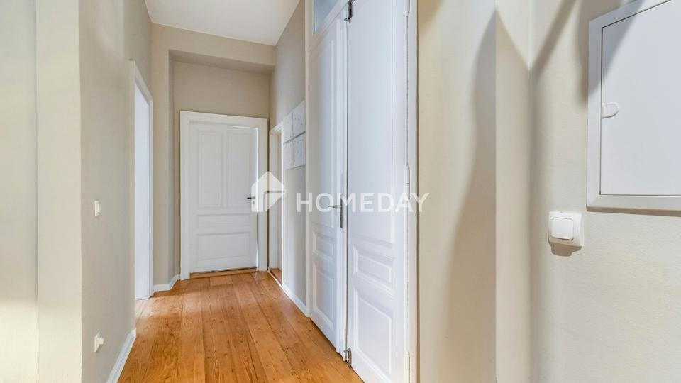Die Wohnung selbst bietet ca. 86 Quadratmeter Wohnfläche und eine klare, gut nutzbare Raumstruktur. Holzdielen unterstreichen den wohnlichen Charakter und passen stimmig zum Baujahr. Stuckelemente und maßgefertigte Einbauschränke setzen dezente Akzente und schaffen Stauraum, ohne den Räumen ihre Offenheit zu nehmen.