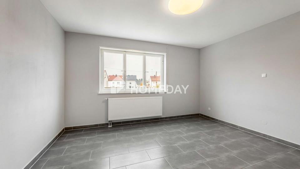 Im Erdgeschoss empfängt ein zentraler Flur, von dem aus sich sämtliche Räume erschließen. Der große Wohnbereich geht offen in das Esszimmer über, das durch seine bodentiefen Fenster und den Zugang zur Terrasse besonders hell und freundlich wirkt. Die angrenzende Küche ist funktional geschnitten und bietet viel Raum für individuelle Gestaltung. Zwei Schlafzimmer, ein modernes Badezimmer mit Tageslicht und ein separater Abstellraum komplettieren das Raumangebot auf dieser Ebene.