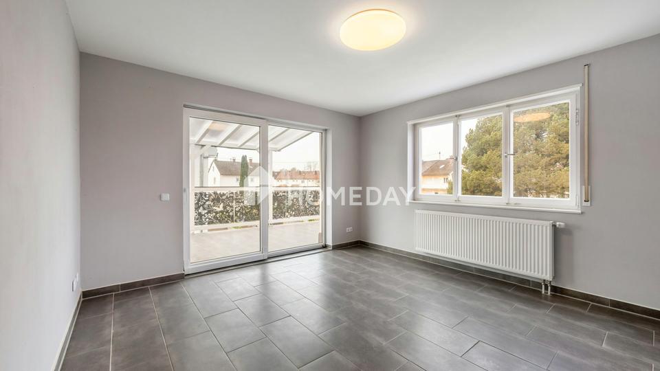 Das Obergeschoss spiegelt den Grundriss des Erdgeschosses weitestgehend wider und bietet ebenfalls zwei Schlafzimmer, ein modernes Badezimmer und eine große, überdachte Dachterrasse mit Blick ins Grüne. Die Wohnräume sind mit hochwertigen Fliesenböden ausgestattet, die nicht nur pflegeleicht, sondern auch zeitlos elegant sind. Eine Gaszentralheizung aus dem Jahr 2020 sorgt für effiziente Wärmeversorgung und spiegelt den technisch aktuellen Standard des Hauses wider. Ergänzt wird die Ausstattung durch Holzfenster mit Rollläden.