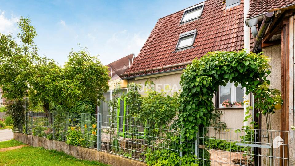 Das charmante Einfamilienhaus im gepflegten Zustand steht in attraktiver, sehr ruhiger Lage. Auf dem ca. 304 Quadratmeter großen, nicht einsehbaren Grundstück befinden sich neben dem Haus ein Vorgarten, eine Scheune und eine Garage. Ein rund ein Kilometer entfernter Schrebergarten gehört ebenfalls zum Grundstück.