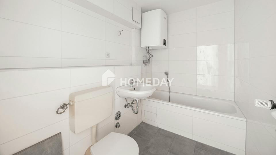 Der Wohn- und Schlafbereich ist offen gestaltet und verbindet sich harmonisch mit der angrenzenden Küche. Die offene Küchenlösung erlaubt es, den Wohnraum kommunikativ zu nutzen und trotz kompakter Größe ein luftiges Raumgefühl zu bewahren. Das Badezimmer ist mit einer Badewanne ausgestattet – ein praktisches Plus im Alltag.