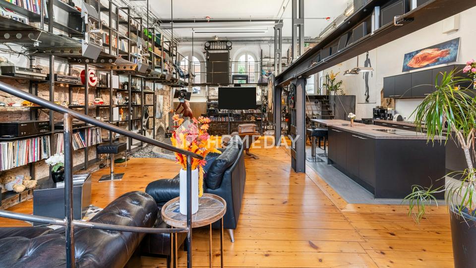 Mit rund 216 Quadratmetern Wohnfläche und einem durchdachten Grundriss bietet die Wohnung vier weitläufige Zimmer, offene Sichtachsen sowie ein unverwechselbares Loftgefühl. Der Hauptraum mit beeindruckenden 90 Quadratmetern bildet das Herzstück der Immobilie. Große Fensterflächen lassen viel Tageslicht herein und schaffen ein helles, offenes Ambiente. Besonderes Highlight ist das begehbare Regal, das den Raum strukturiert und zugleich ein stilprägendes Element darstellt.
