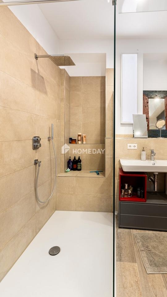 Die Wohnung verfügt über zwei moderne Badezimmer: eines mit ebenerdiger Dusche sowie ein weiteres mit Dusche, Badewanne und Handtuchwärmer. Hochwertige Materialien und stilvolle Armaturen schaffen eine elegante Wohlfühlatmosphäre.
