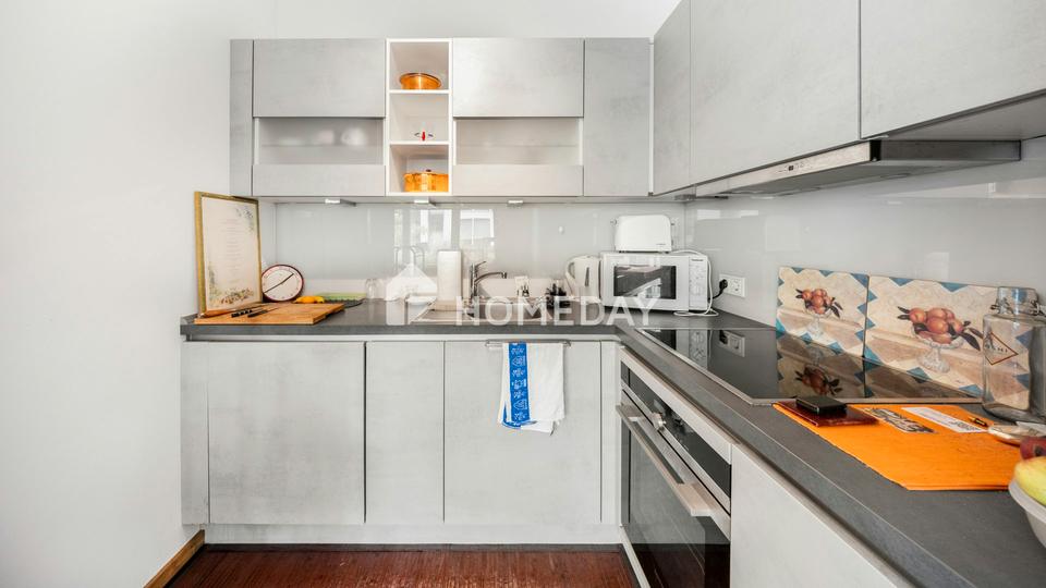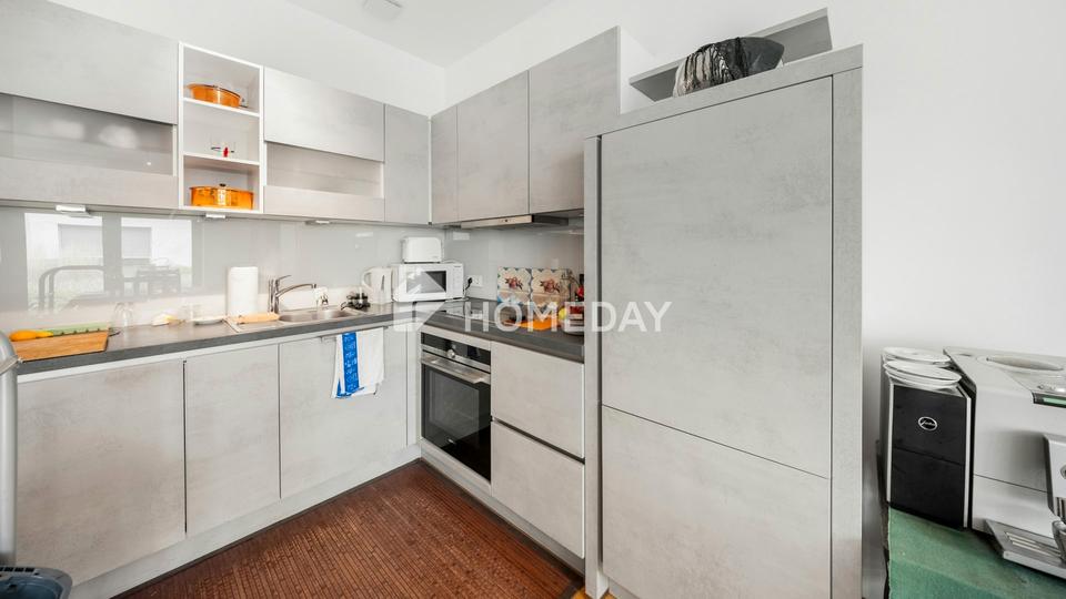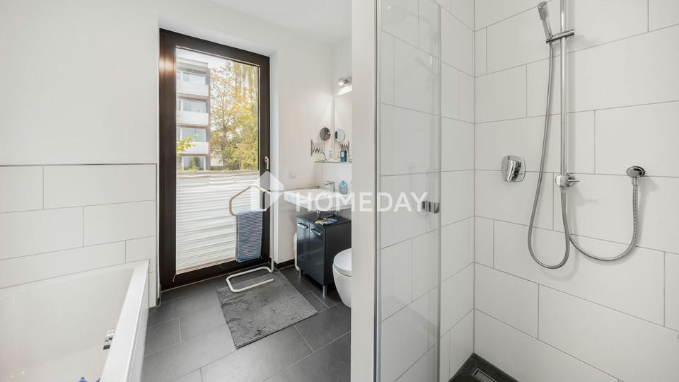 Auf rund 80 Quadratmetern Wohnfläche überzeugt die Wohnung durch einen lichtdurchfluteten, offenen Grundriss mit großzügig geschnittenem Wohn- und Essbereich sowie einer hochwertig ausgestatteten, offenen Küche. Bodentiefe Fenster sorgen für eine angenehme Transparenz und schaffen einen fließenden Übergang zur großzügigen Terrasse, die Ruhe, Privatsphäre und Sonne in idealer Kombination bietet – ein seltener Luxus in dieser Lage.