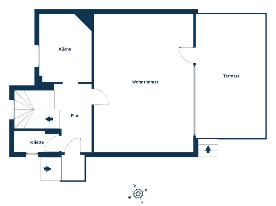 Bereits beim Betreten des Hauses empfängt Sie ein freundlicher Eingangsbereich mit klassischem Treppenaufgang. Das Erdgeschoss präsentiert sich mit einem großzügigen Wohnzimmer, das durch seine weite Fensterfront viel Tageslicht erhält und einen direkten Zugang zur Terrasse eröffnet. Hier entsteht eine angenehme Verbindung zwischen Innen- und Außenbereich. Die angrenzende Küche ist mit einer Einbauküche ausgestattet und funktional geschnitten, sodass sich Kochen und gemeinsames Beisammensein mühelos verbinden lassen. Ergänzt wird das Raumangebot auf dieser Ebene durch ein Gäste-WC.