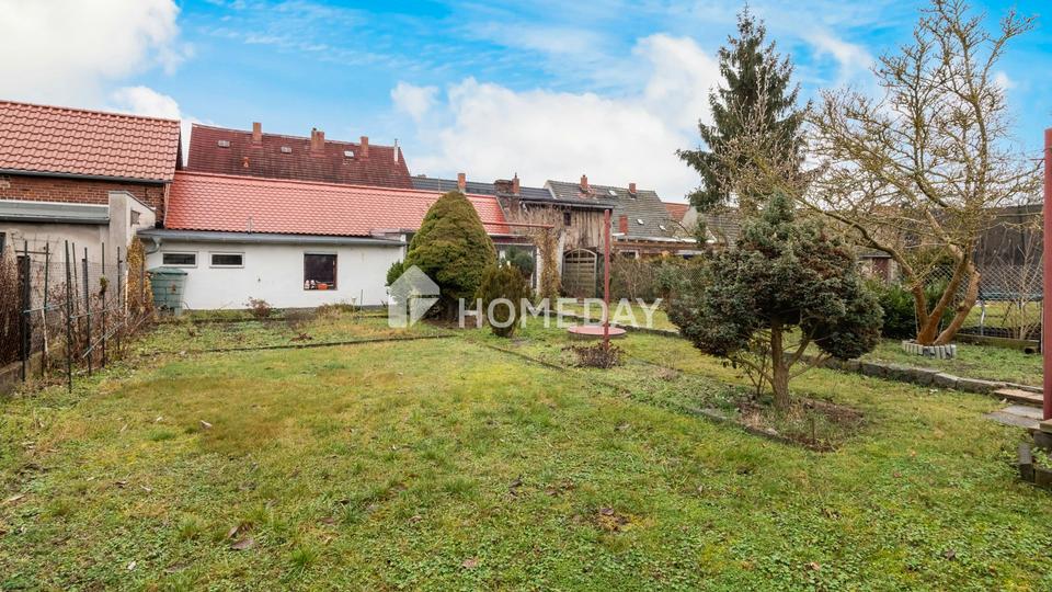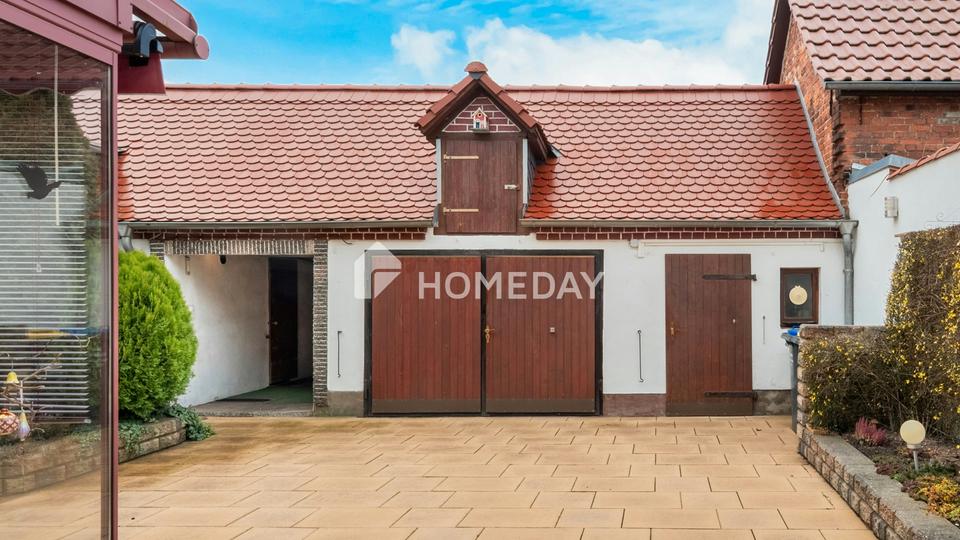 Der Innenhof stellt eine vielseitig nutzbare Fläche dar. Er lädt dazu ein, eine gemütliche Sitzecke mit Grill zu gestalten oder ihn mit Pflanzen individuell zu begrünen. Gleichzeitig kann er als Stellfläche für Fahrzeuge genutzt werden und bietet einen direkten Zugang zur Garage, was den Alltag besonders praktisch macht. Ergänzt wird das Außenangebot durch den Garten, der ausreichend Raum für den Anbau von Obst und Gemüse bietet oder sich als Spiel- und Bewegungsfläche für Kinder eignet. Hier lassen sich individuelle Gartenträume ebenso verwirklichen wie ein naturnaher Rückzugsort im Grünen.