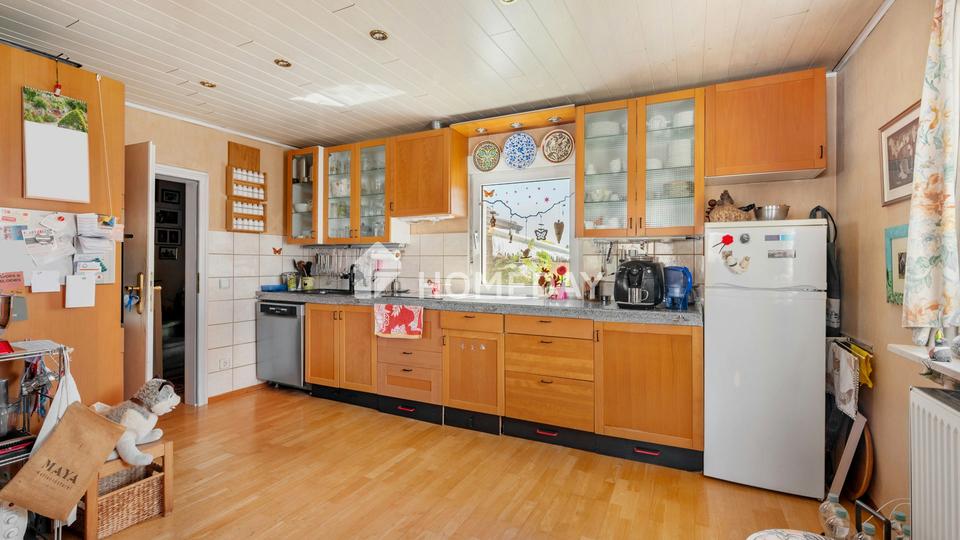 Im Obergeschoss spielt das Leben: Das großzügige Wohn- und Esszimmer lädt zum Verweilen ein – mit genügend Platz für große Esstische, Familienabende und gemütliche Rückzugsorte. Die angrenzende Küche ist mit einer gepflegten Einbauküche ausgestattet.