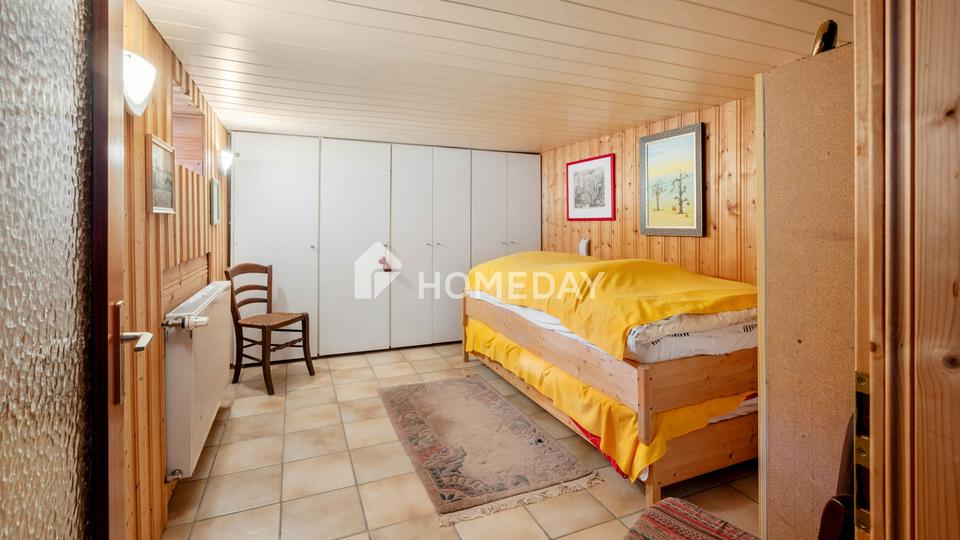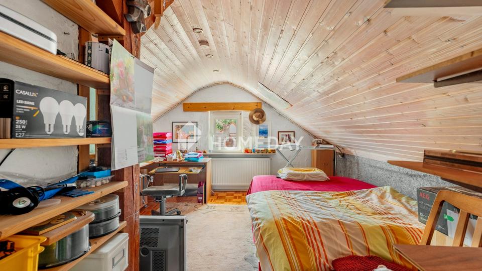 Ein weiteres Zimmer unter dem Dach bietet sich perfekt als Arbeitsbereich oder Gästezimmer an. Dank der Dachschrägen wirkt der Raum besonders gemütlich – ein echtes Refugium für ruhige Momente.