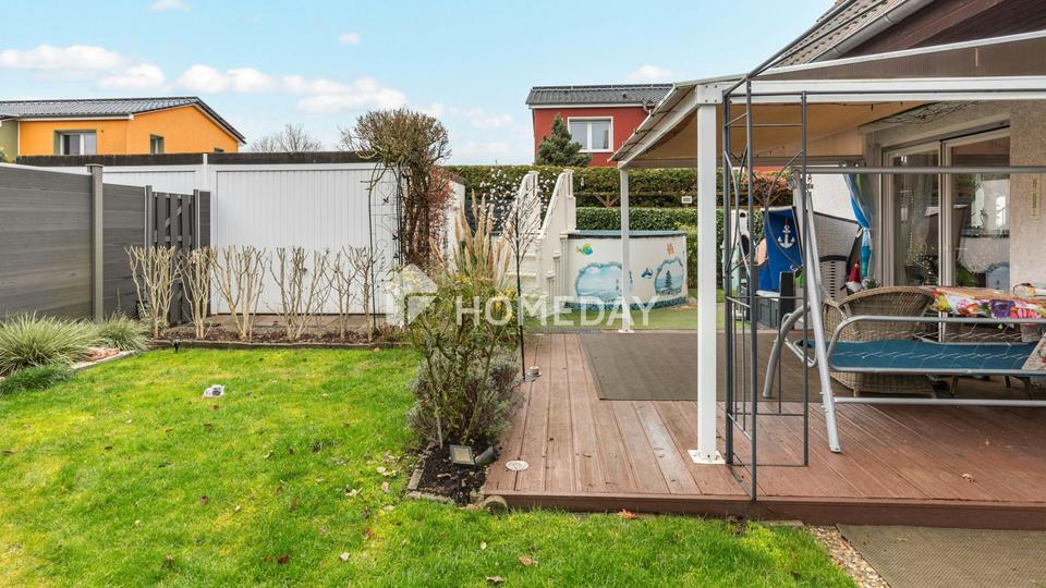 Von hier aus gelangen Sie direkt auf die beeindruckende überdachte Südost-Terrasse, die das Wohnen im Freien zu jeder Jahreszeit ermöglicht. Der liebevoll gestaltete Garten mit fest eingebautem Grillkamin lädt zum Entspannen und geselligen Beisammensein ein – ein idealer Rückzugsort für Familien, Gartenliebhaber und Hobby-Griller. Das Grundstück ist komplett umzäunt und bietet somit zusätzliche Sicherheit und Ruhe.
