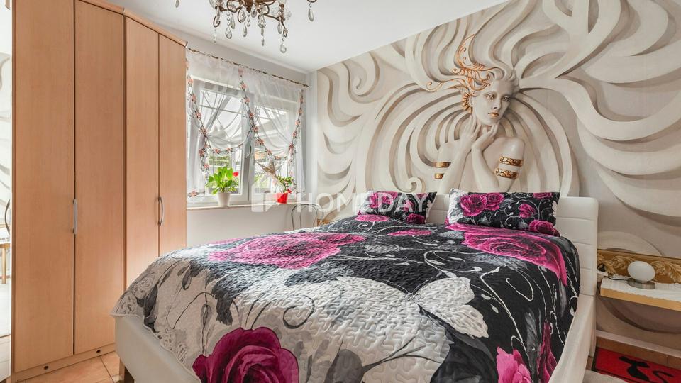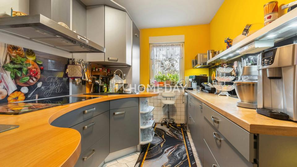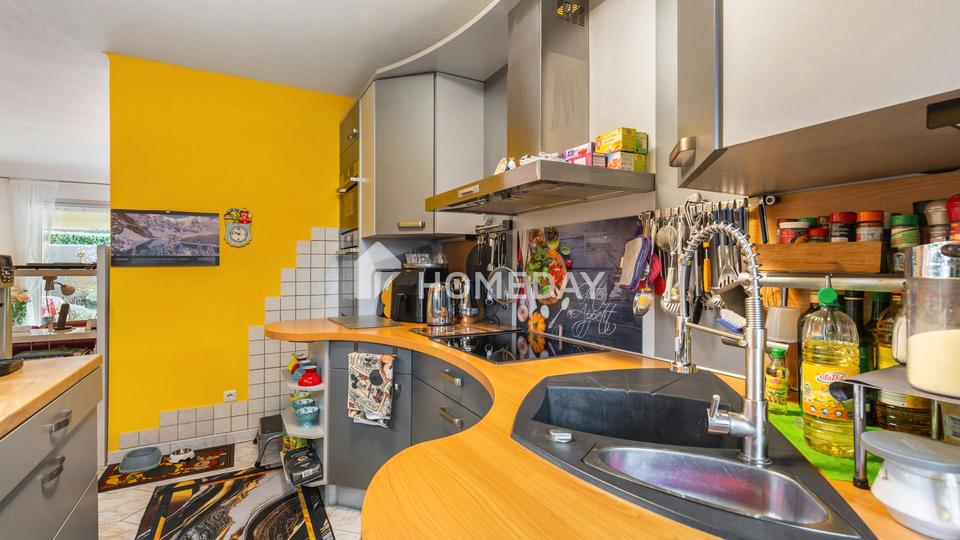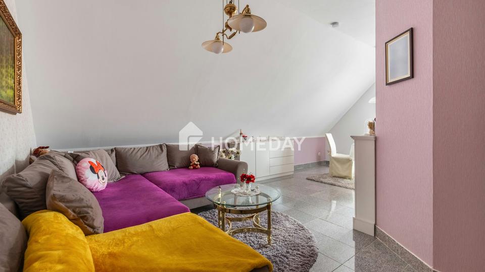 Im ersten Obergeschoss befinden sich weitere großzügige Räume, samt einer Küche, dank der ursprünglichen Planung als Einliegerwohnung. Damit eröffnet sich auch die attraktive Möglichkeit, die Immobilie in zwei separate Wohneinheiten aufzuteilen – ideal für Mehrgenerationenwohnen, Vermietung oder zusätzliche Flexibilität in der Nutzung. Ein besonderes Highlight ist der nach Süden ausgerichtete Balkon samt Markise, der einen wunderbaren Blick in die Umgebung ermöglicht und zusätzliche Entspannungsmöglichkeiten bietet. Das Dachgeschoss wurde bereits zu Wohnzwecken ausgebaut und bietet viel Freiraum für individuelle Nutzung: ob als Jugendzimmer, großzügiges Studio oder Büro.